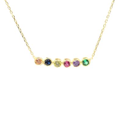 Gümüş kolye 925 ayar gümüşten yapılmıştır. 6 sıra su yolu model kolye 2,4 cm'ye 0,4 cm boyutlarındadır. Zinciri 42 cm uzunluğundadır ve taşları sitrin, safir, peridot, garnet, ametist, zümrüt renk zirkondur. Ağırlığı 2,12 gramdır.