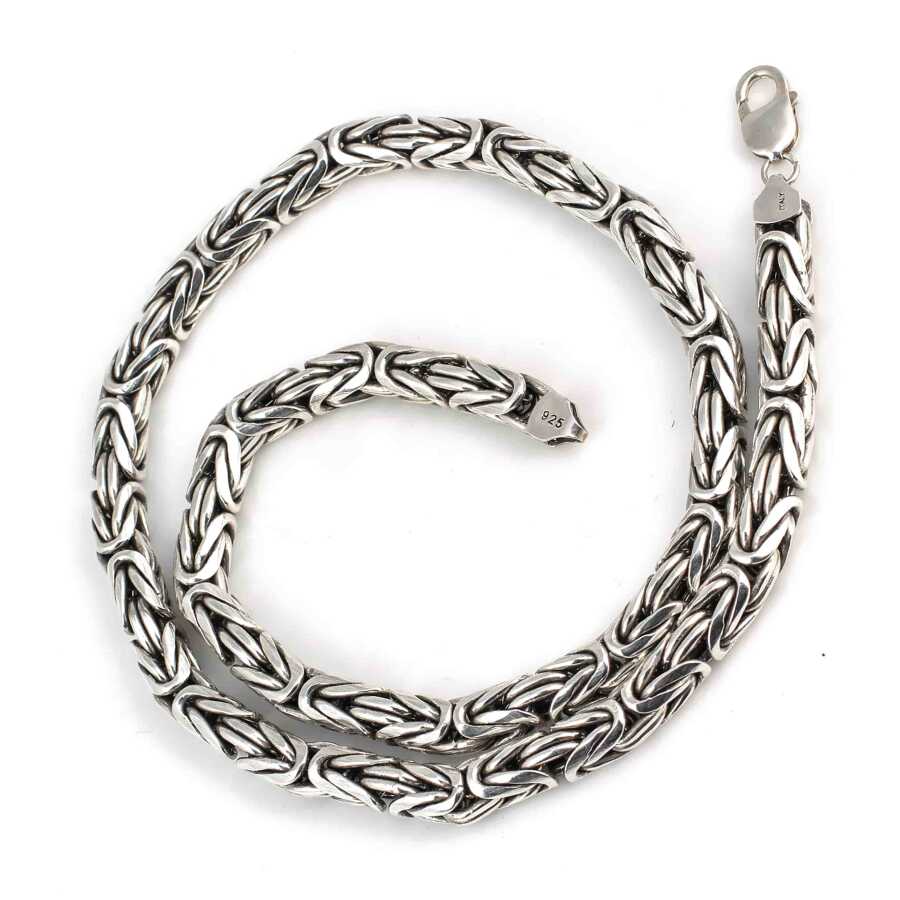 Gümüş zincir 925 ayar gümüşten üretilmiştir. El işi yuvarlak kral zincir 8 mm kalınlığında ve 70 cm uzunluğundadır. Kolye taşsızdır. Ağırlığı 249,7 gramdır.