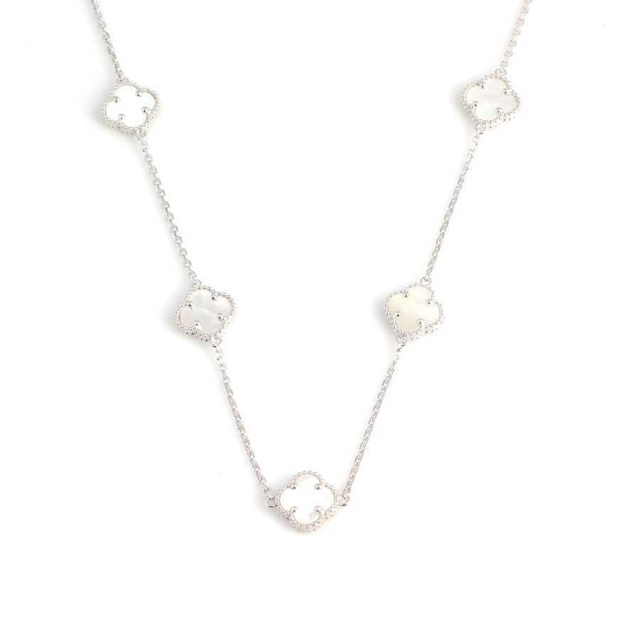 Gümüş kolye 925 ayar gümüşten yapılmıştır Yonca model kolye 52 cm uzunluğundadır Kolye üzerinde 9 adet yonca figürü mevcuttur Yonca figürü 1,0 cm boyutunda sedef taşlıdır . Ağırlığı 12,39 gramdır.