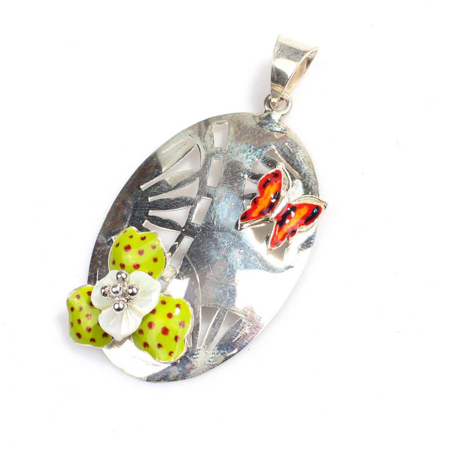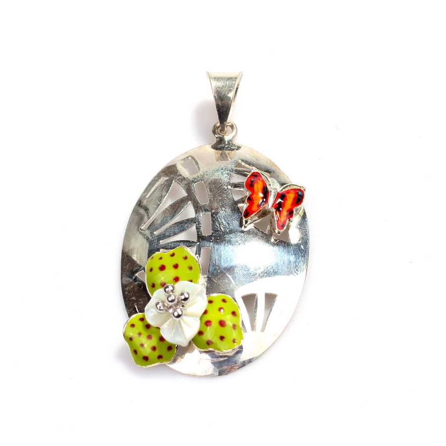 Kolye ucu 925 ayar gümüşten imal edilmiştir. Oval dışa bombeli parça üzerinde kelebek ve çiçek şekilleri vardır. Zincir dahil değildir. Kolye ucu üzerinde taş yoktur. Kolye ucu 5,39 gram ağırlığındadır.