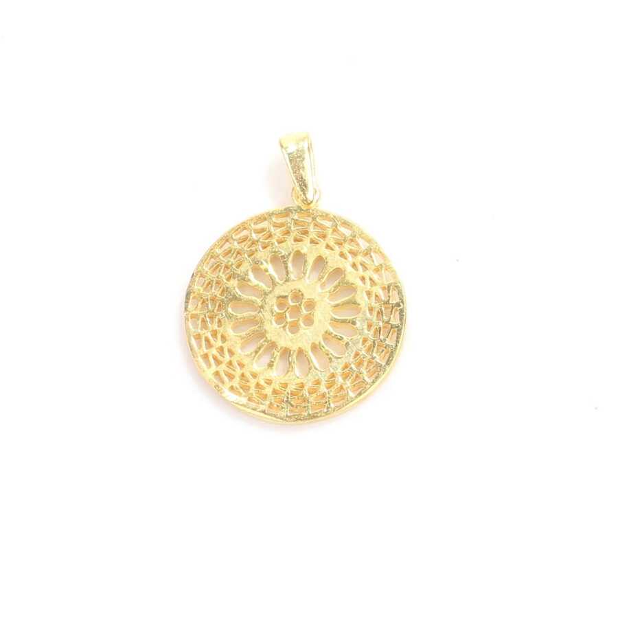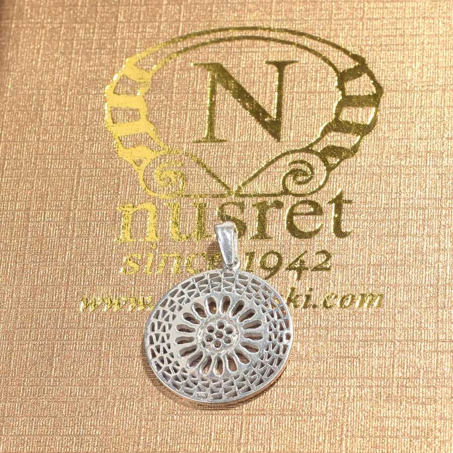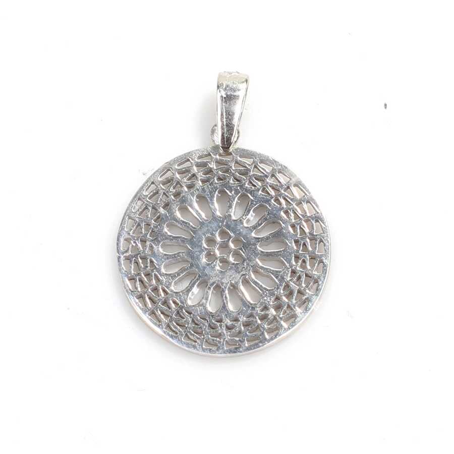 Kolye ucu 925 ayar gümüşten imal edilmiştir. Yuvarlak Ajur desenli kolye ucu 2,0 cm'ye 2,6 cm boyutlarındadır. Zincir dahil değildir. Kolye ucu taşsızdır. Kolye ucu 2,58 gram ağırlığındadır.