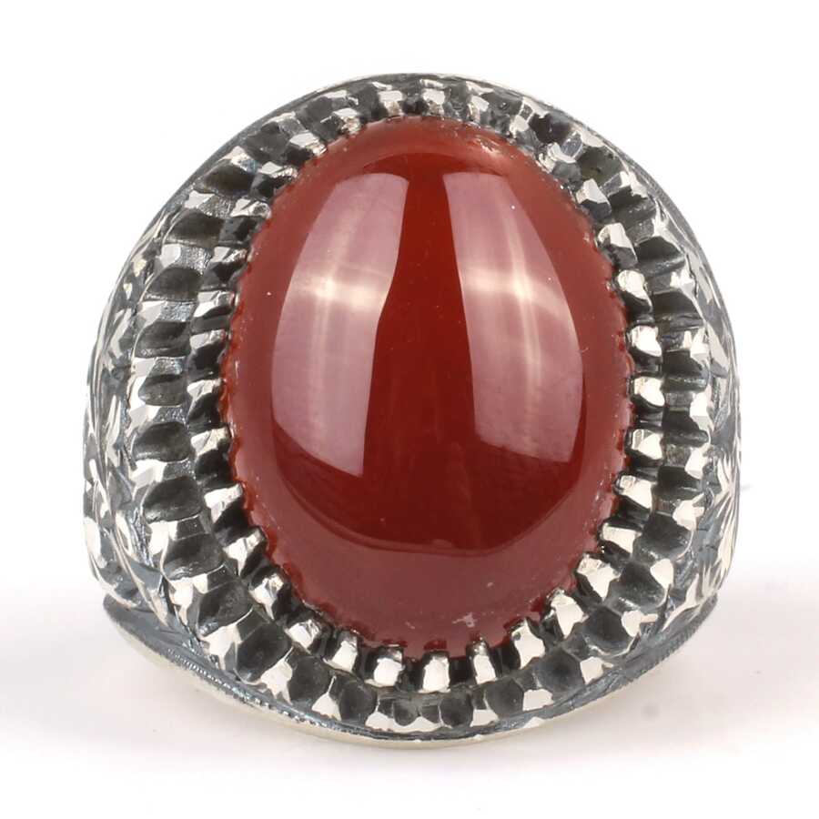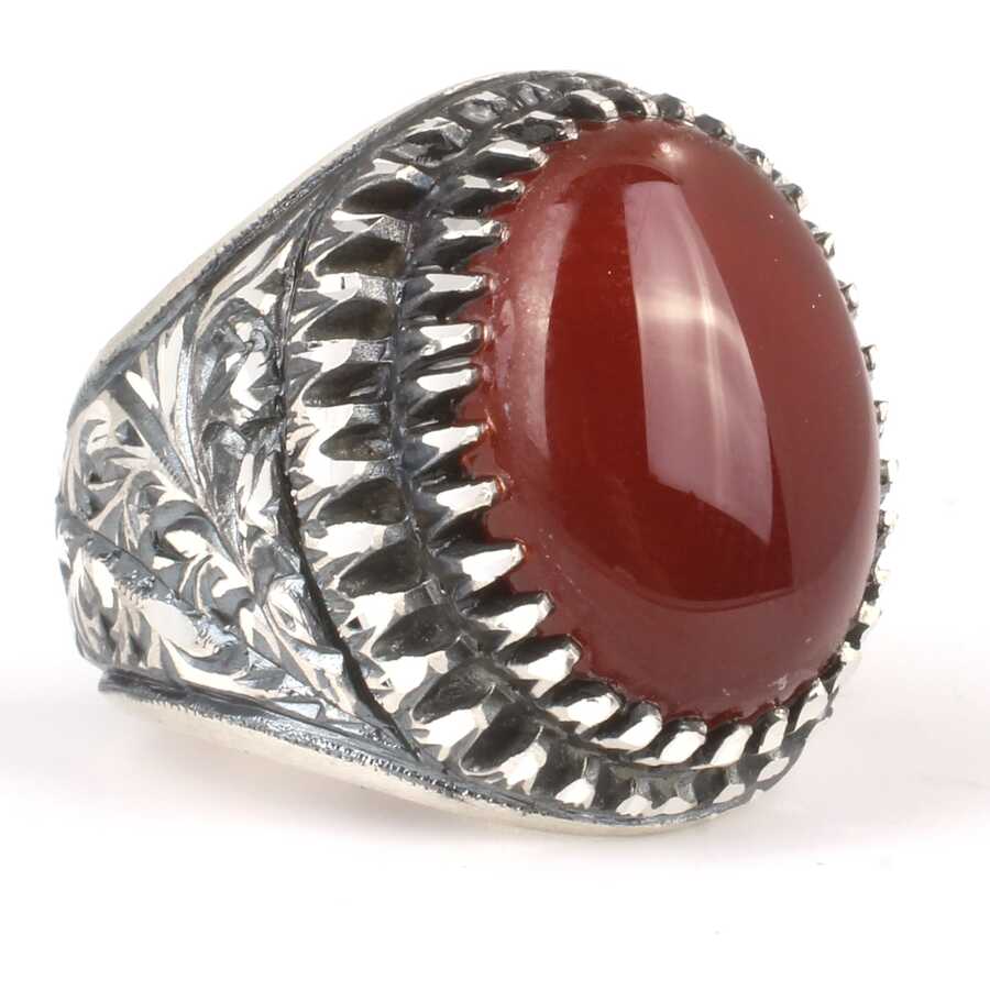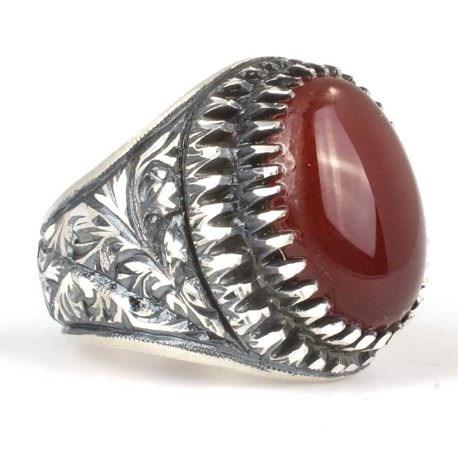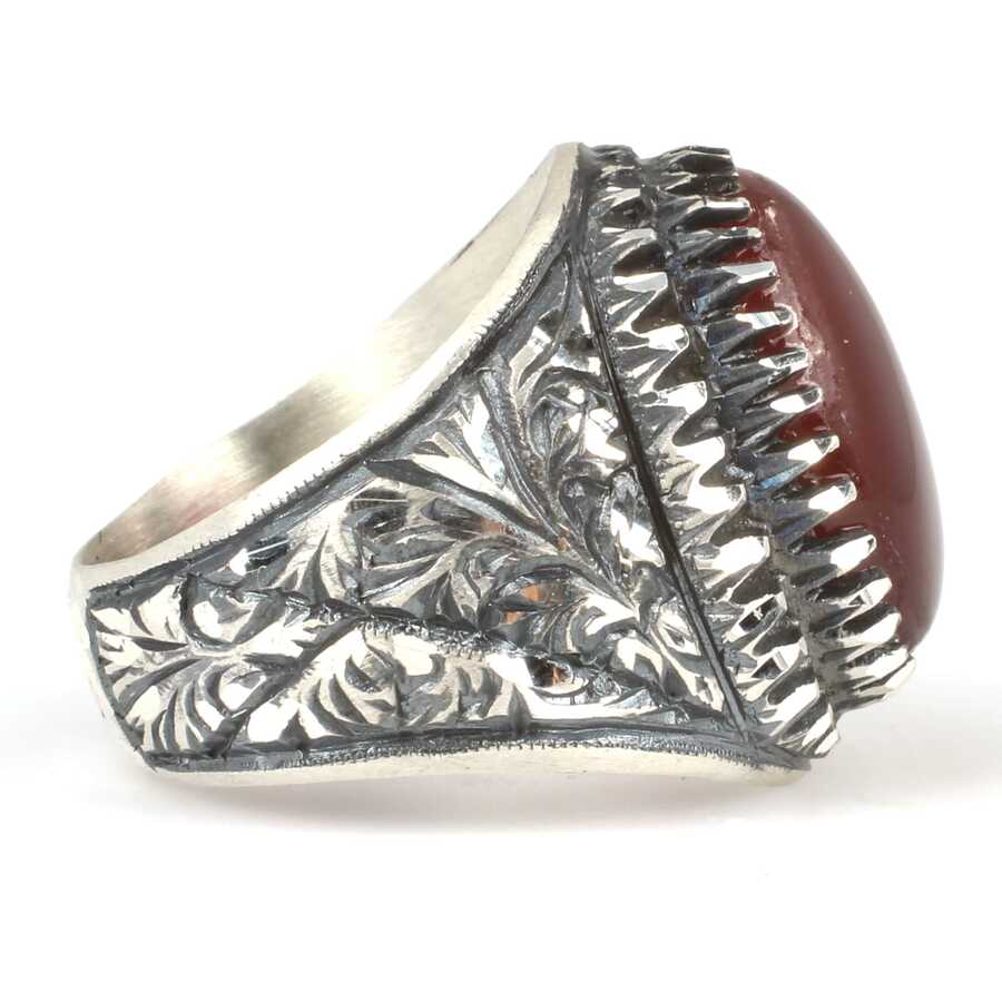 Yüzük 925 ayar gümüşten üretilmiştir. Yüzüğün üzerinde el kalemi atılarak tasarlanmıştır. Taşlı yüzük 2,2 cm'ye 1,7 cm boyutlarındadır. Resimdeki yüzük 26 ölçüdür, ancak tüm ölçüler özel olarak yapılabilmektedir. Yüzük akik taşlıdır. Ağırlığı 20,54 gramdır.