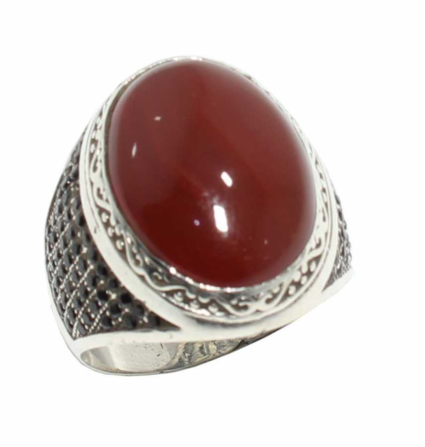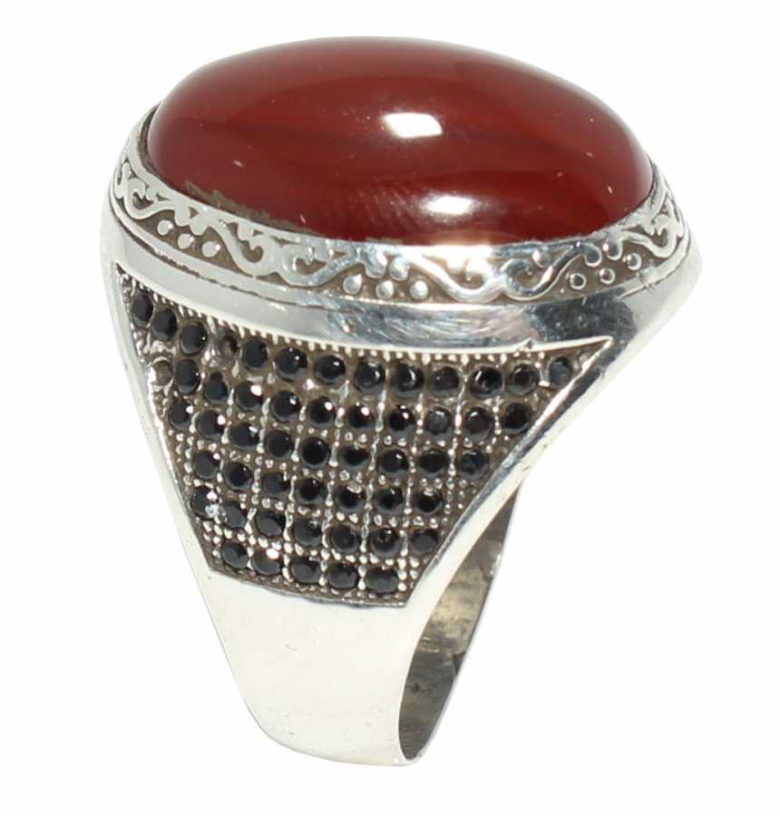 Yüzük 925 ayar gümüşten üretilmiştir. Taşlı yüzük 1,8 cm'ye 1,7 cm boyutlarındadır. Resimdeki yüzük 23 ölçüdür, ancak tüm ölçüler özel olarak yapılabilmektedir. Yüzük zirkon ve akik renk taşlıdır. Ağırlığı 14,18 gramdır.