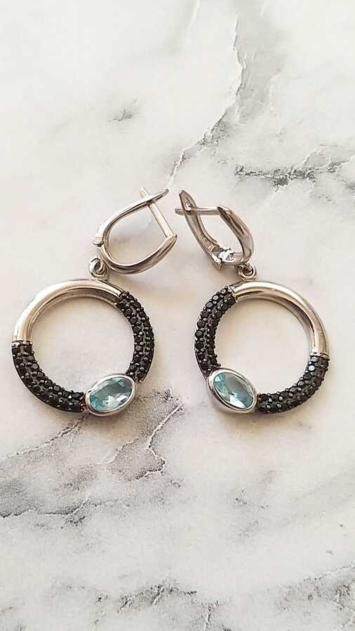 Gümüş küpe 925 ayar gümüşten yapılmıştır. Taşlı yuvarlak model küpe 3,4 cm'ye 1,9 cm boyutlarındadır. Küpe siyah ve akuamarin renk zirkon taşlıdır. Ağırlığı 4 gramdır.
