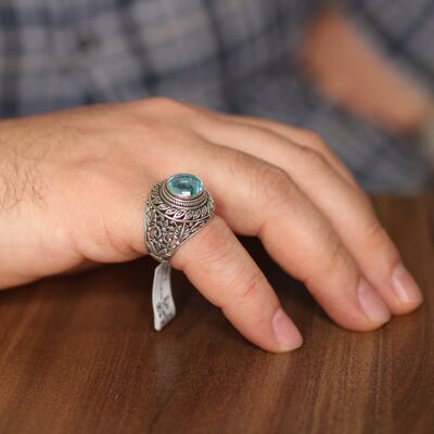 Yüzük 925 ayar gümüşten üretilmiştir. Taşlı yüzük 1,0 cm boyutlarındadır. Resimdeki yüzük 16 ölçüdür, ancak tüm ölçüler özel olarak yapılabilmektedir. Yüzük akuamarin renk taşlıdır. Ağırlığı 7,1 gramdır.