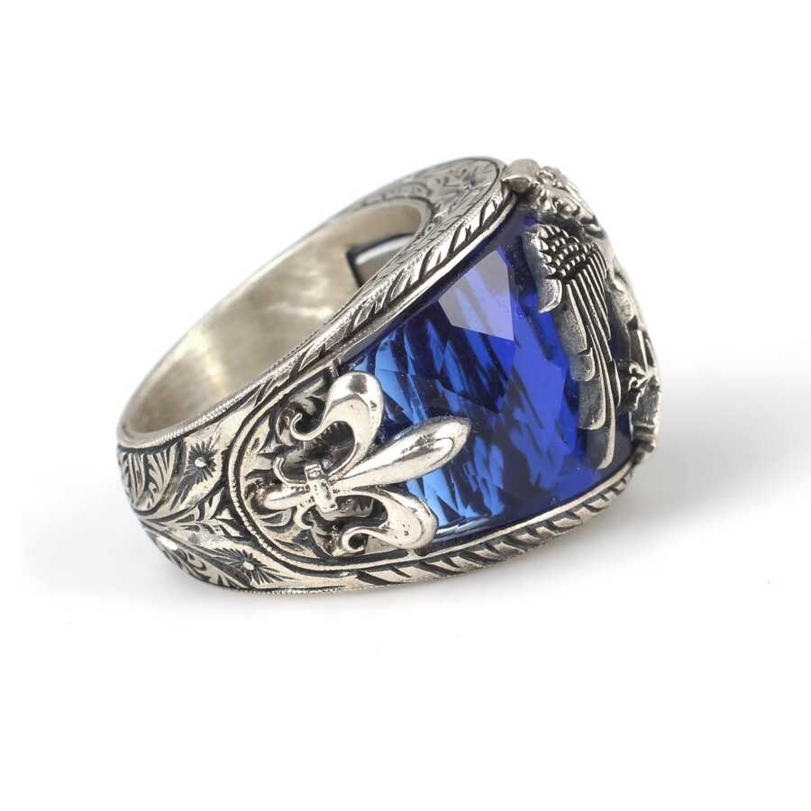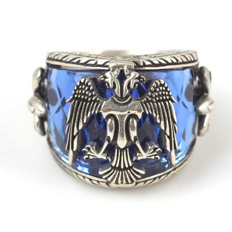 925 Ayar Gümüş Akuamarin Taşlı Osmanlı Kartalı El İşi Erkek Yüzüğü