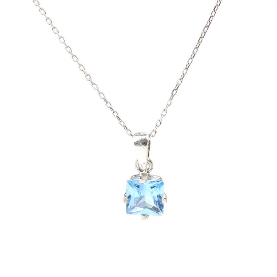 Gümüş kolye 925 ayar gümüşten yapılmıştır. Kare kolye 0,9 cm boyutlarındadır. Zinciri 45 cm uzunluğundadır. Kolye akuamarin renk zirkon taşlıdır. Ağırlığı 2,11 gramdır.