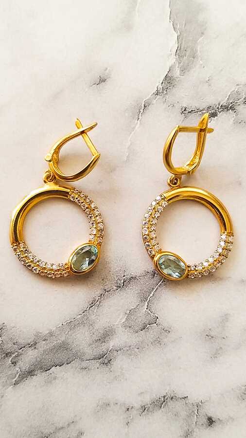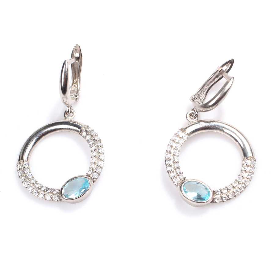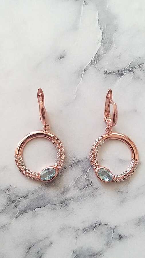 Gümüş küpe 925 ayar gümüşten yapılmıştır. Taşlı yuvarlak model küpe 3,4 cm'ye 1,9 cm boyutlarındadır. Küpe beyaz ve akuamarin renk zirkon taşlıdır. Ağırlığı 4,15 gramdır.