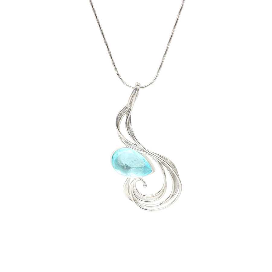 Gümüş kolye 925 ayar gümüşten yapılmıştır. Gümüş kolye 7,0 cm'ye 2,3 cm boyutlarındadır. Kolye zinciri 45 cm uzunluğundadır. Kolye akuamarin renk zirkon taşlıdır. Ağırlığı 7,8 gramdır.