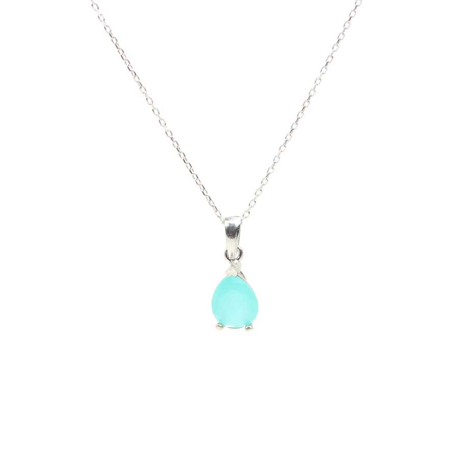 Gümüş kolye 925 ayar gümüşten yapılmıştır. Damla 3 tırnaklı kolye 0,8 cm'ye 1,2 cm boyutlarındadır. Zinciri 45 cm uzunluğundadır ve taşları amazonit renk zirkondur. Ağırlığı 2,8 gramdır.