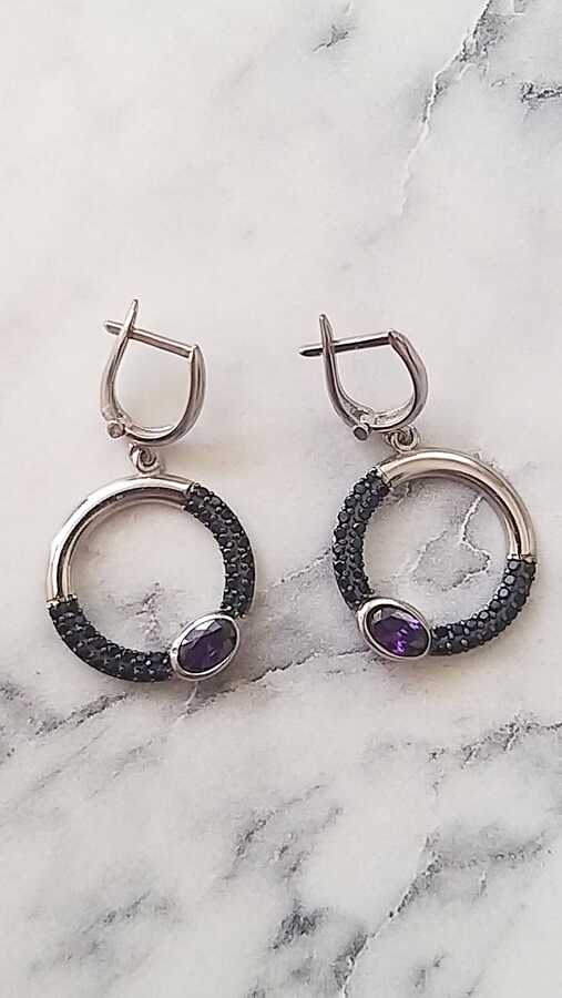 Gümüş küpe 925 ayar gümüşten yapılmıştır. Taşlı yuvarlak model küpe 3,4 cm'ye 1,9 cm boyutlarındadır. Küpe siyah ve ametist renk zirkon taşlıdır. Ağırlığı 4 gramdır.