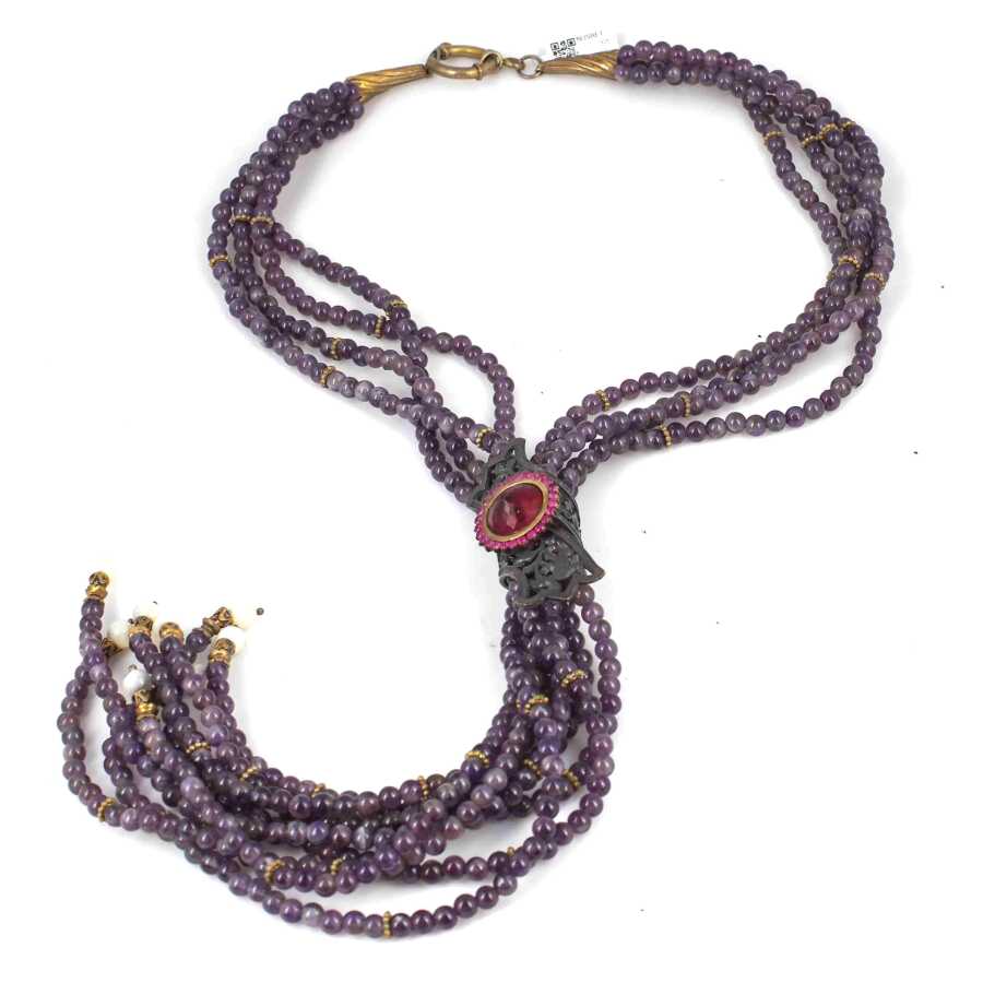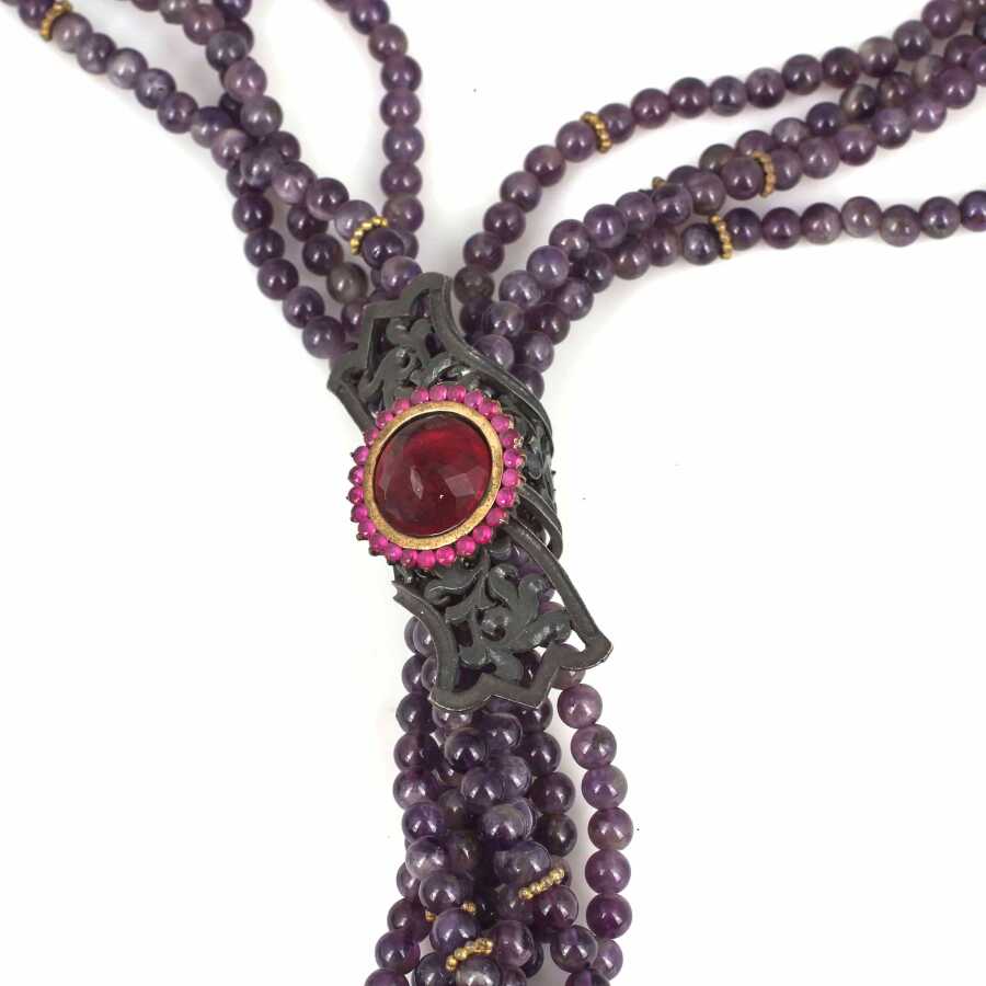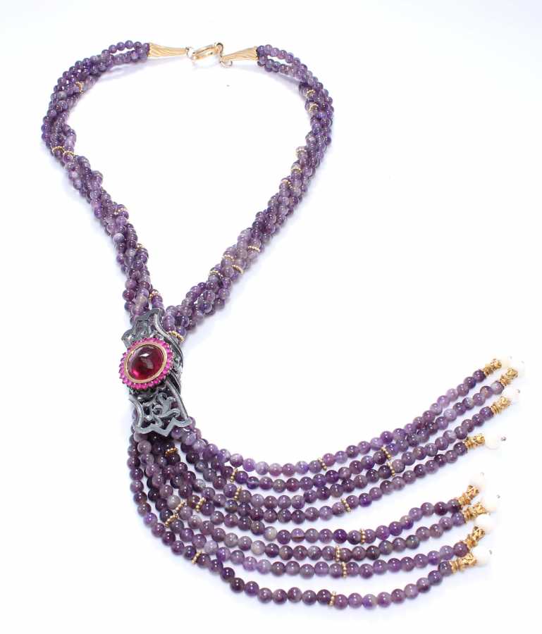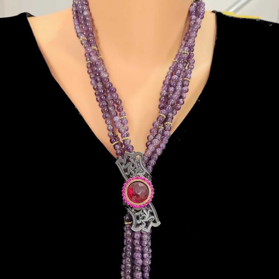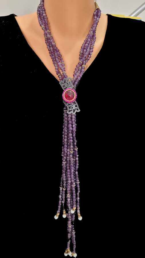 Gümüş kolye 925 ayar gümüşten üretilmiştir. Gümüş kolye 60 cm uzunluğundadır. Ametist taşlarından oluşan 4 sıralı kolye ucunda telkari şeklindeki gümüş taşlı kafes sayesinde kolye uzunluğunu da ayarlayabilirsiniz. Kolye ametist taşlıdır. Ağırlığı 251,45 gramdır.
