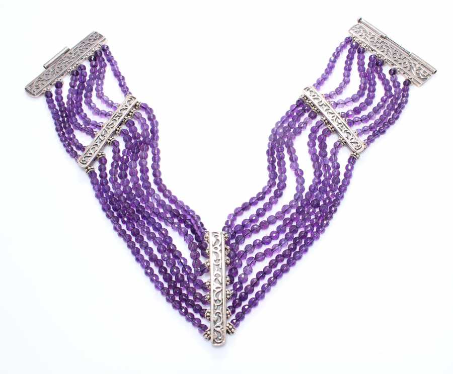 925 ayar gümüş 35 cm, ametist taşlı üç adet ara bağlantılı (choker) gerdanlık. Gramı: 112,41