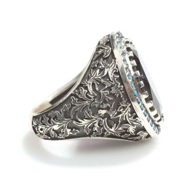 925 ayar gümüştür. Ortası Ametist oval fasetli taşlı kenarları mavi firuze taşlı kolları işlemeli 20 ölçü. 2,5 x 2 cm boyutlarında erkek yüzüğüdür. Gramı 19,13