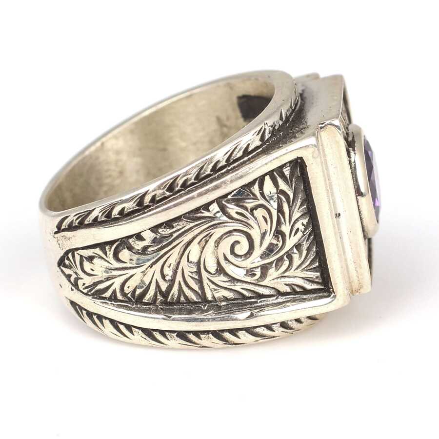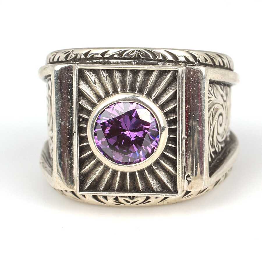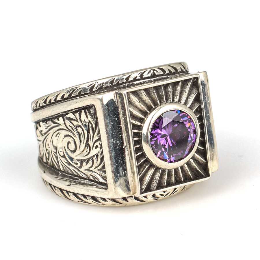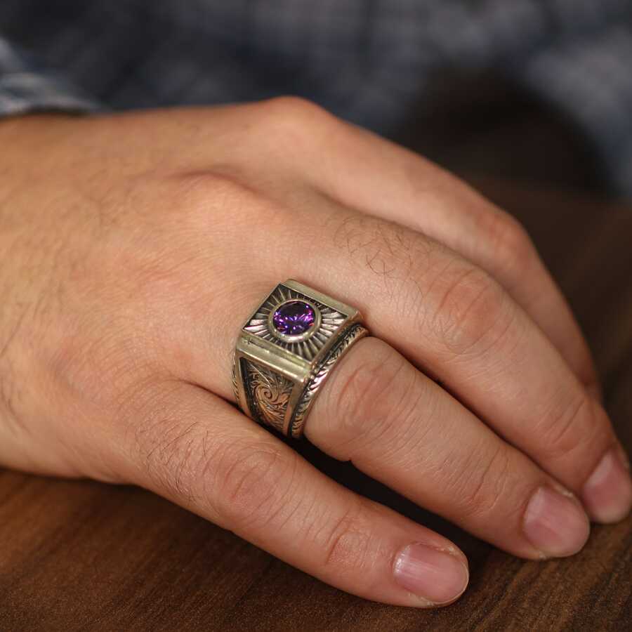 925 Ayar Gümüş Ametist Taşlı Güneş Pırıltısı Erkek Yüzüğü