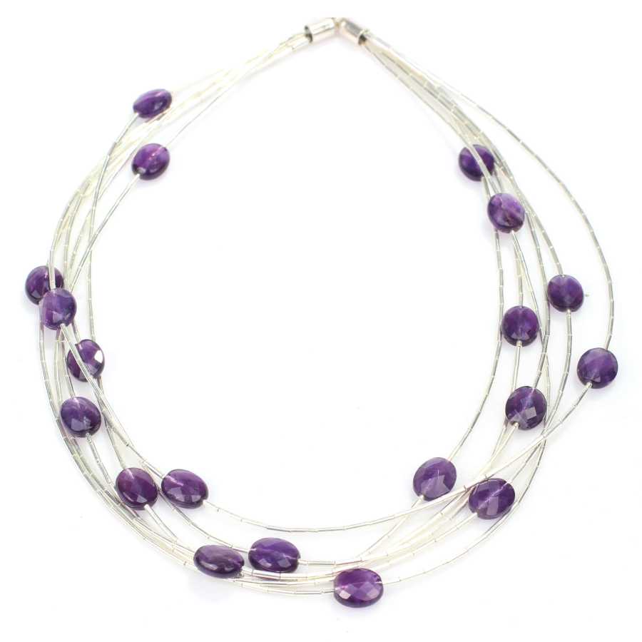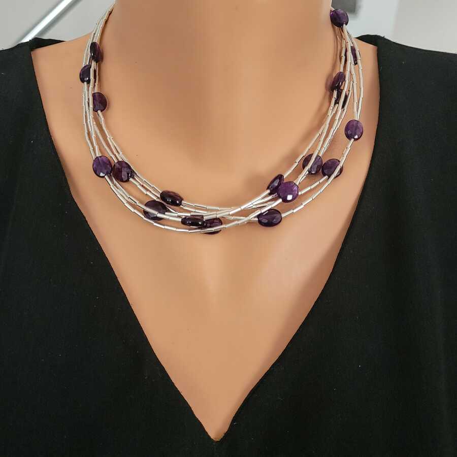 925 ayar gümüştür. Ametist taşlı şarnel 6 sıralı kolyedir. 40 cm uzunluğundadır. Gramı: 34,06 gr