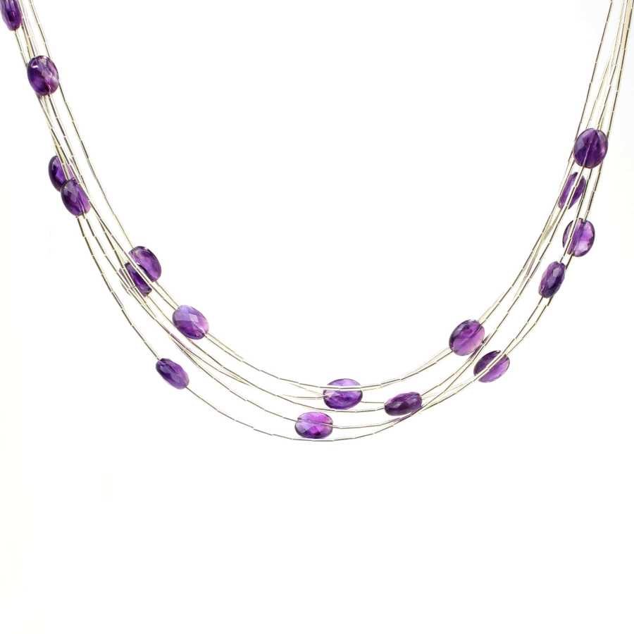 Gümüş kolye 925 ayar gümüşten yapılmıştır. Ametist taşların aralarına şarnel borular eklenerek 6 sıra dizilmiş kolye 40 cm uzunluğundadır. Kolye ametist renk taşlıdır. Ağırlığı 34,06 gramdır.