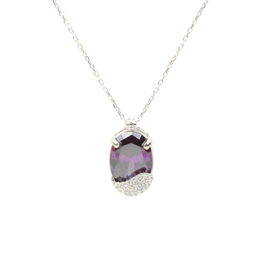 Gümüş kolye 925 ayar gümüşten yapılmıştır. Oval kolye 1,1 cm'ye 1,8 cm boyutlarındadır. Zinciri 45 cm uzunluğundadır. Kolye ametist renk ve zirkon taşlıdır. Ağırlığı 5,16 gramdır.