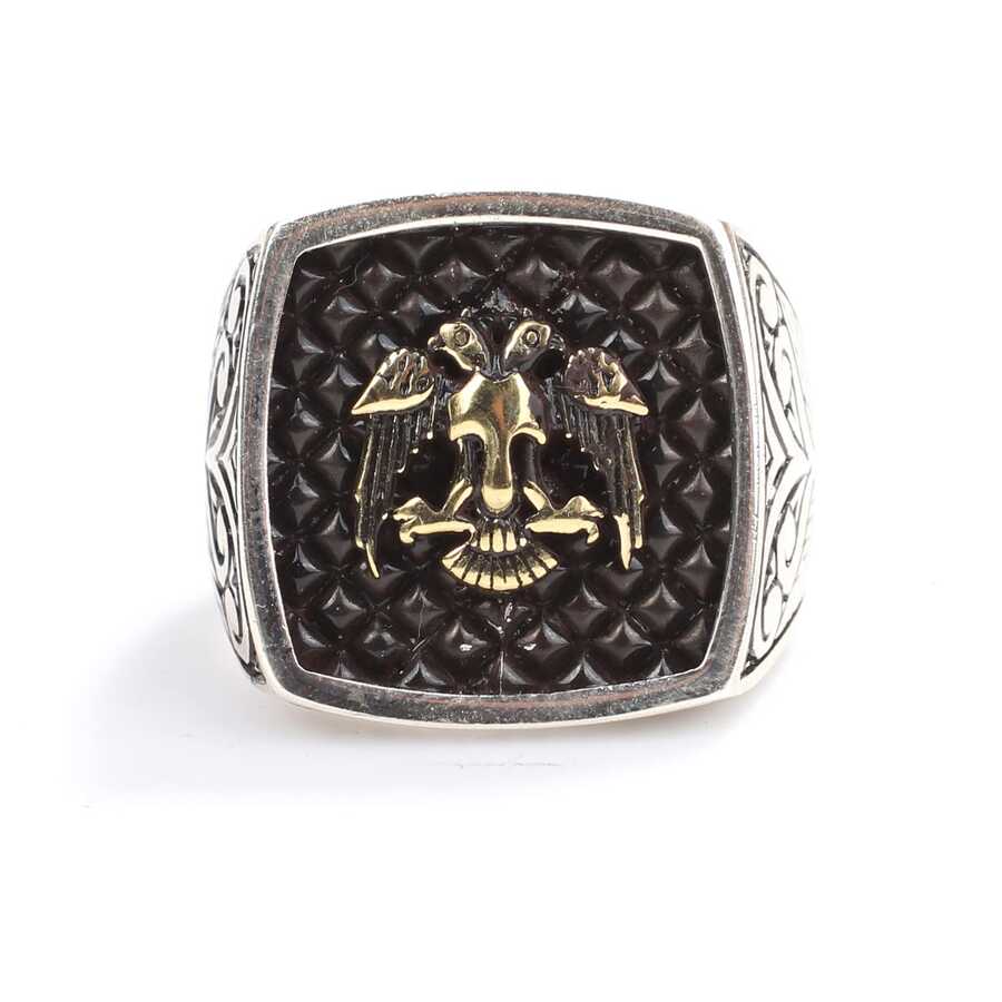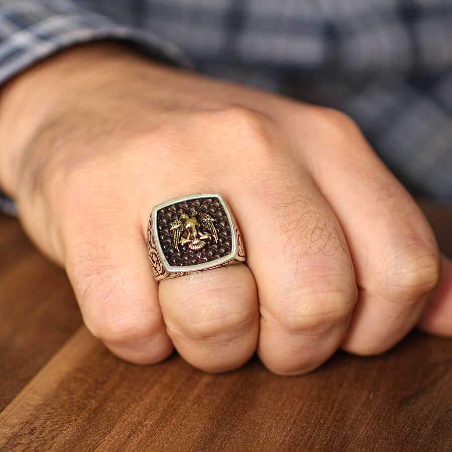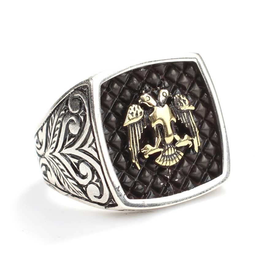 925 ayar gümüştür 23 ölçü 20 x 20 mm kare Anadolu kartalı kolları işlemeli erkek yüzük Gramı: 11,02 gr