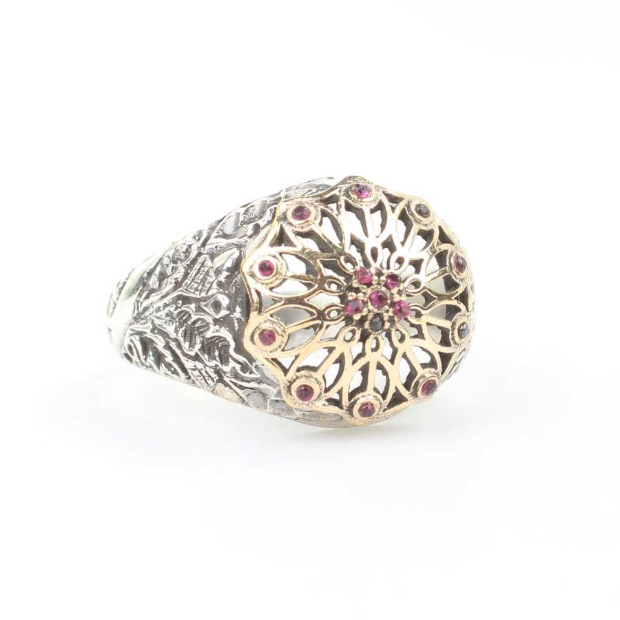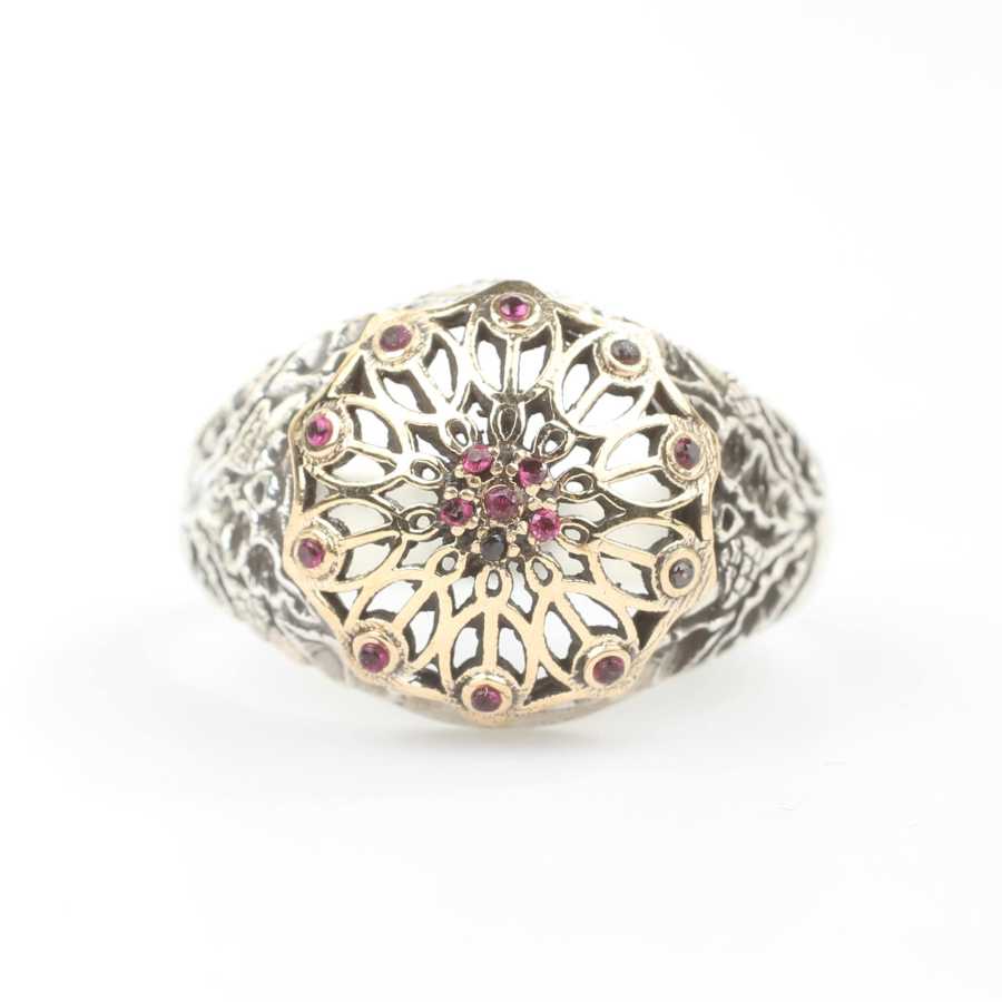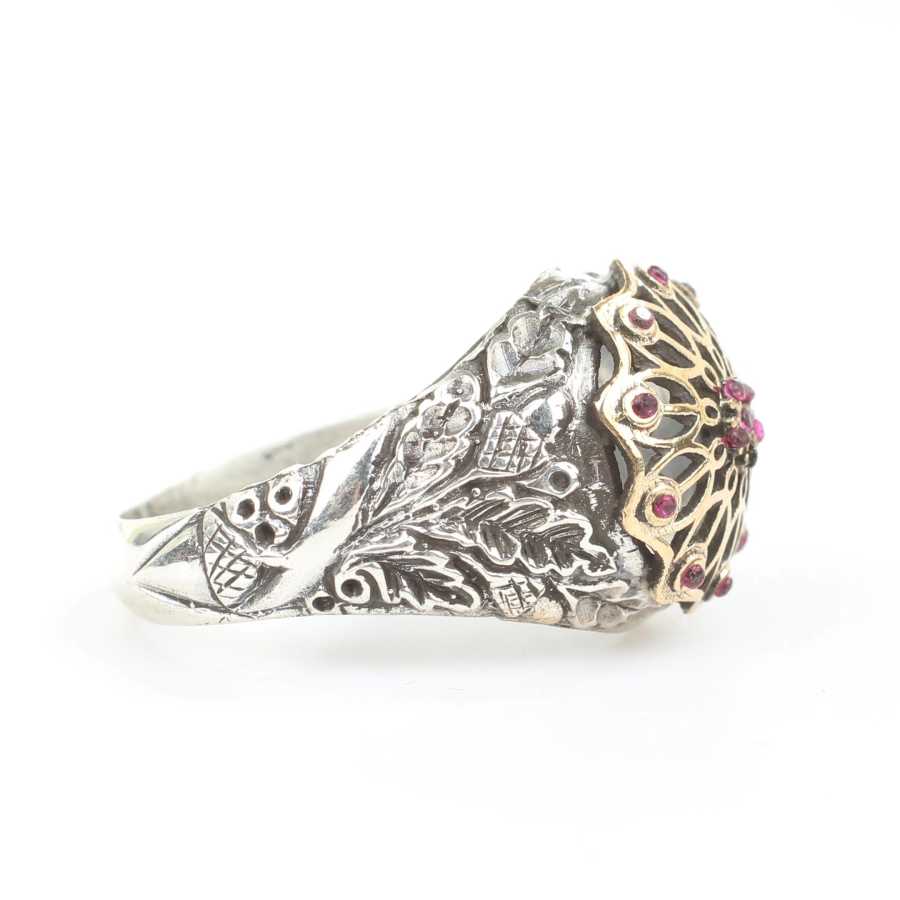 Yüzük 925 ayar gümüşten üretilmiştir. Antik tasarım yüzüğün üst kısmı 1,5 cm boyutlarındadır. Resimdeki yüzük 23 ölçüdür, ancak tüm ölçüler yapılabilmektedir. Antik gümüş yüzük kırmızı renk zirkon taşlıdır. Ağırlığı 6,27 gramdır.