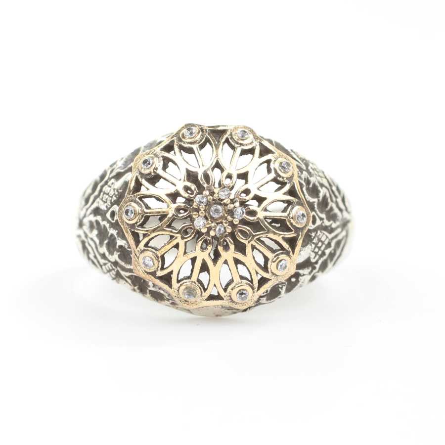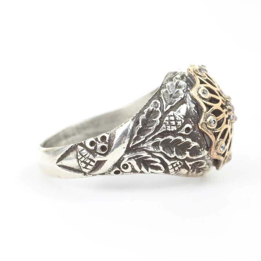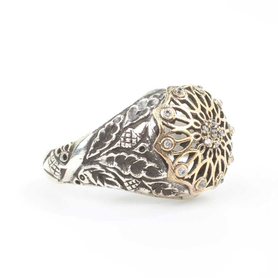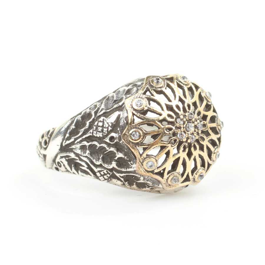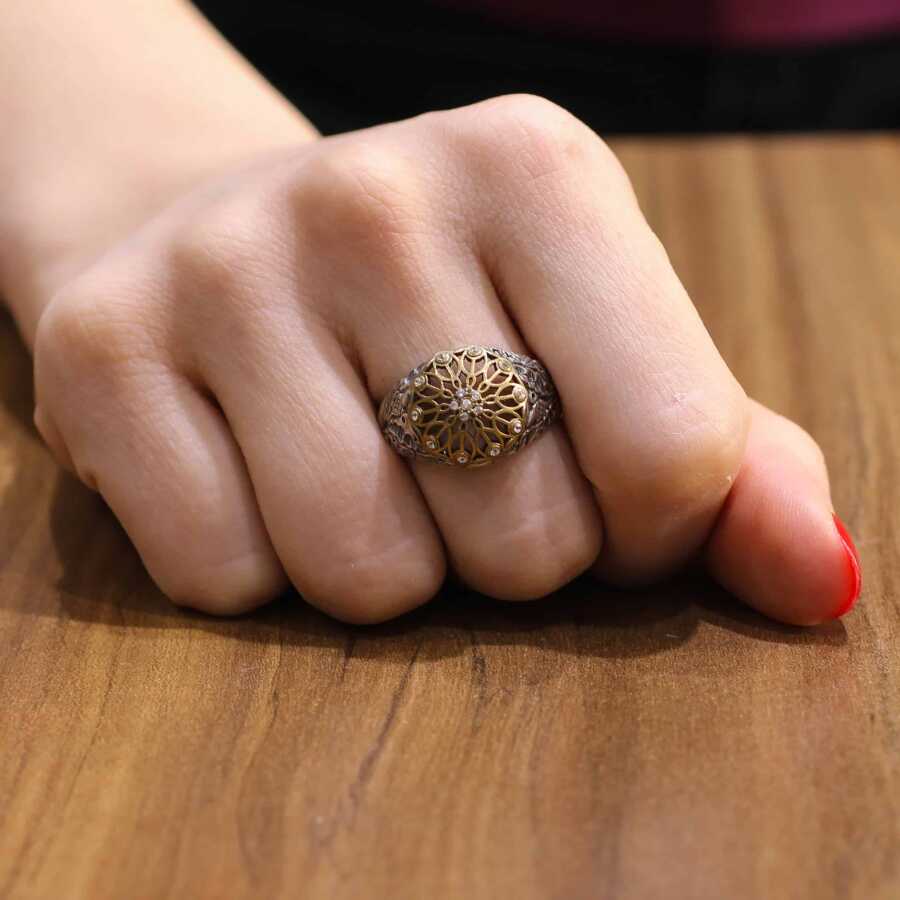 Yüzük 925 ayar gümüşten üretilmiştir. Antik tasarım yüzüğün üst kısmı 1,5 cm boyutlarındadır. Resimdeki yüzük 23 ölçüdür, ancak tüm ölçüler yapılabilmektedir. Antik gümüş yüzük zirkon taşlıdır. Ağırlığı 6,32 gramdır.