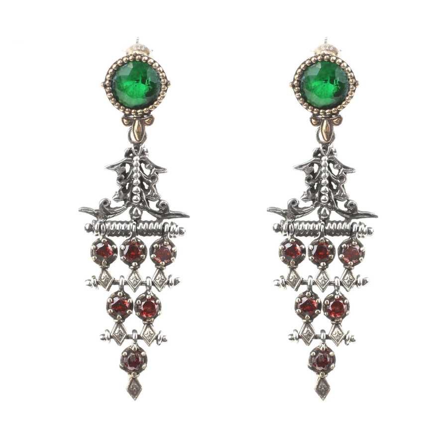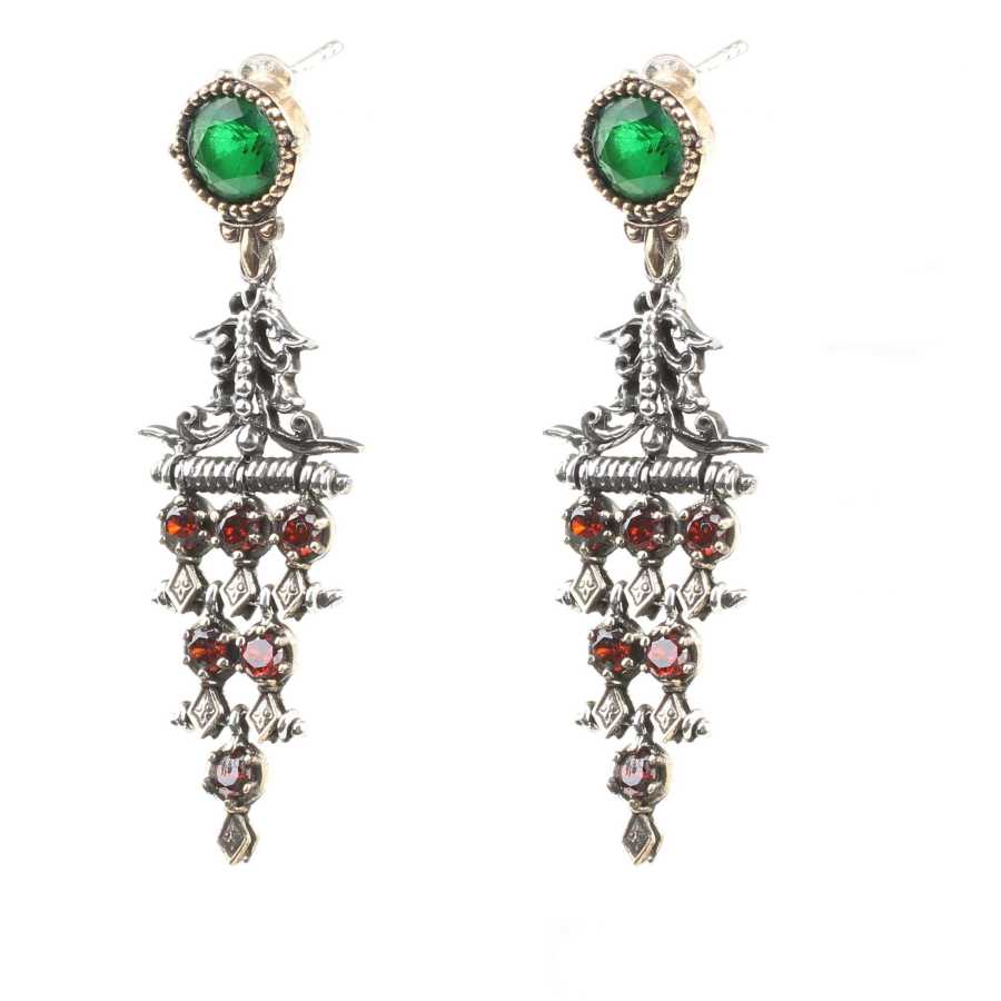 Gümüş küpe 925 ayar gümüşten yapılmıştır. Antik Bizans döneminden esinlenilen üçgen şeklindeki taşlı küpe 1,9 cm'ye 6,0 cm boyutlarındadır. Küpe sentetik zümrüt ve garnet taşlıdır. Ağırlığı 13,8 gramdır.