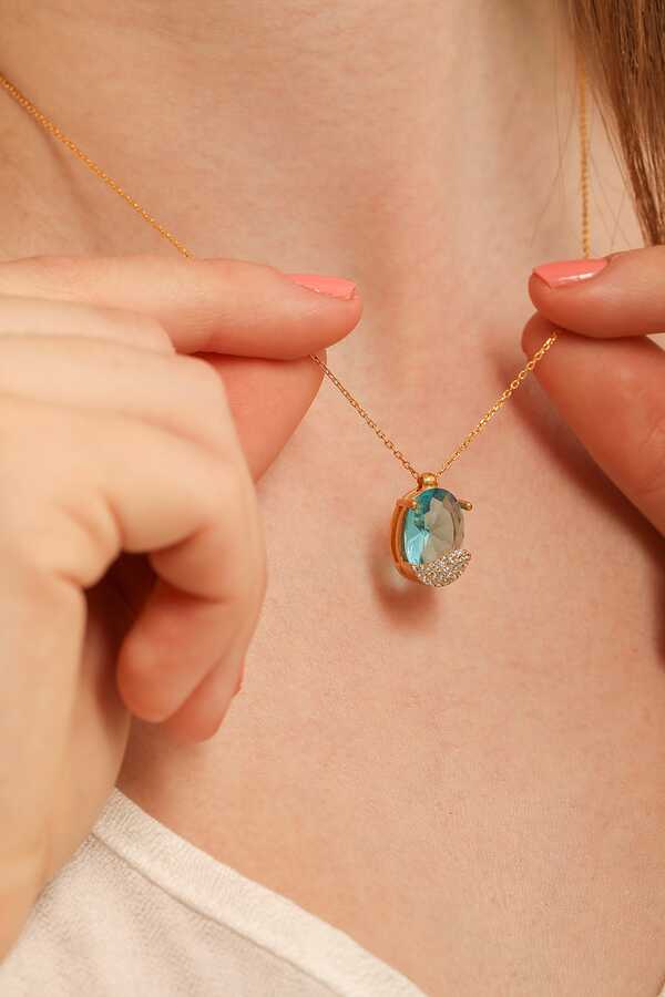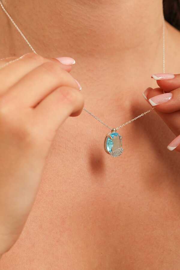 Gümüş kolye 925 ayar gümüşten yapılmıştır. Oval kolye 1,1 cm'ye 1,6 cm boyutlarındadır. Zinciri 45 cm uzunluğundadır. Kolye akuamarin renk ve zirkon taşlıdır. Ağırlığı 3,21 gramdır.