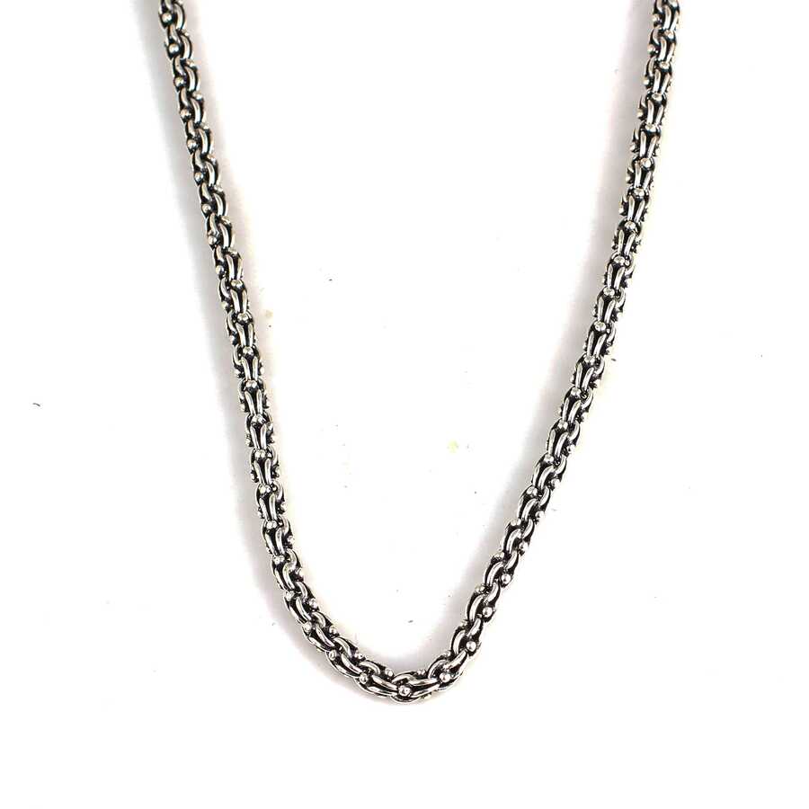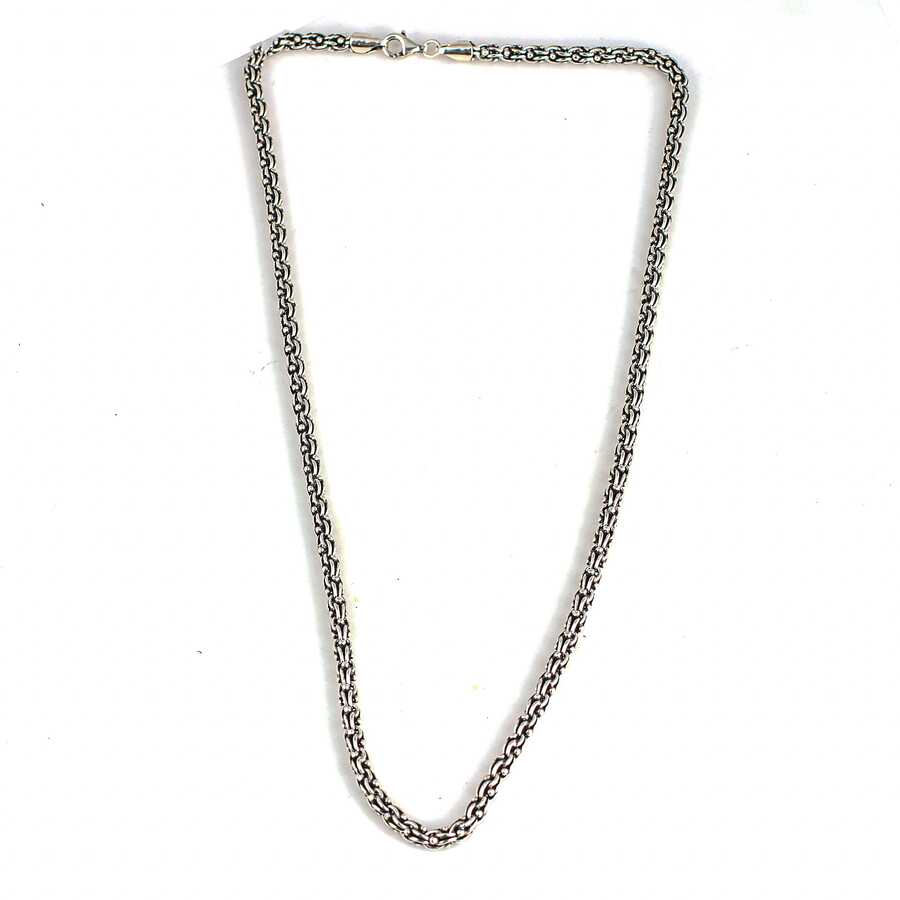 Gümüş kolye 925 ayar gümüşten yapılmıştır. Arnavut zincir kolye 55 cm uzunluğundadır. Kolye 4,4 mm kalınlığındadır. Kolye taşsızdır. Ağırlığı 36,23 gramdır.