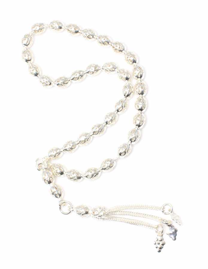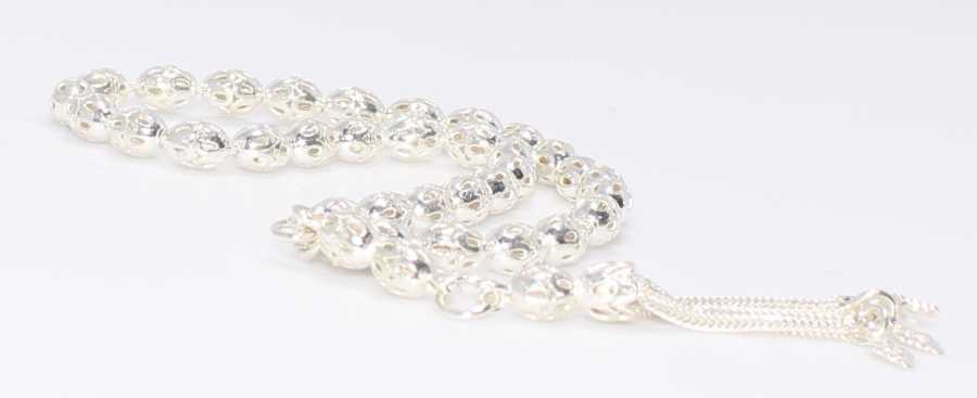Arpa kesim gümüş tesbih topu 0,5 cm'ye 0,7 cm boyutlarındadır. Tespih imamesi dahil 15 cm uzunluğundadır. Gümüş püskülü 5 cm uzunluğunda olup toplam uzunluğu 20cm'dir. Tespihin ağırlığı 13,48 gramdır.
