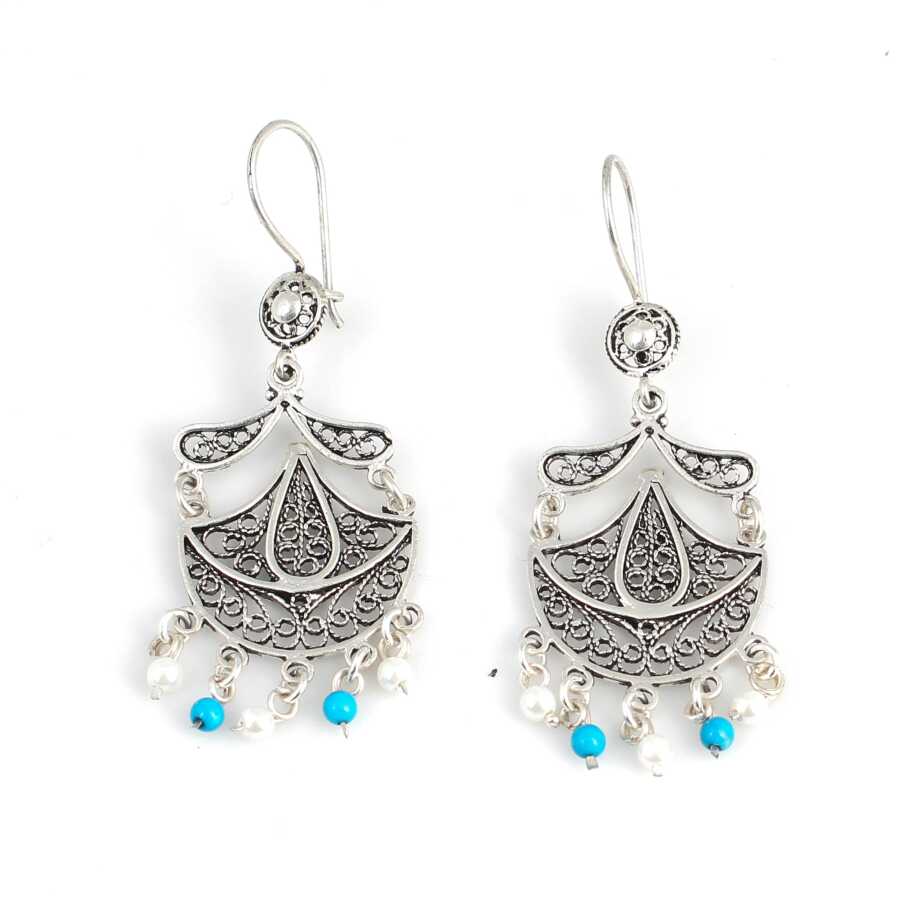 925 Ayar Gümüş Ay Ve Damla Model Turkuaz Ve İnci Taşlı Telkari Küpe