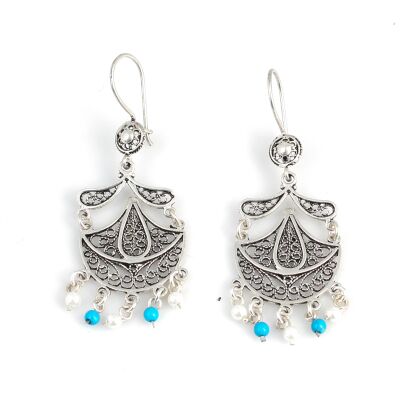 Gümüş telkari küpe 925 ayar gümüşten yapılmıştır Telkari küpe 2,2 cm'ye 6,7 cm boyutlarındadır Telkari küpe turkuaz ve inci taşlardan oluşmaktadır. Ağırlığı 8,4 gramdır.