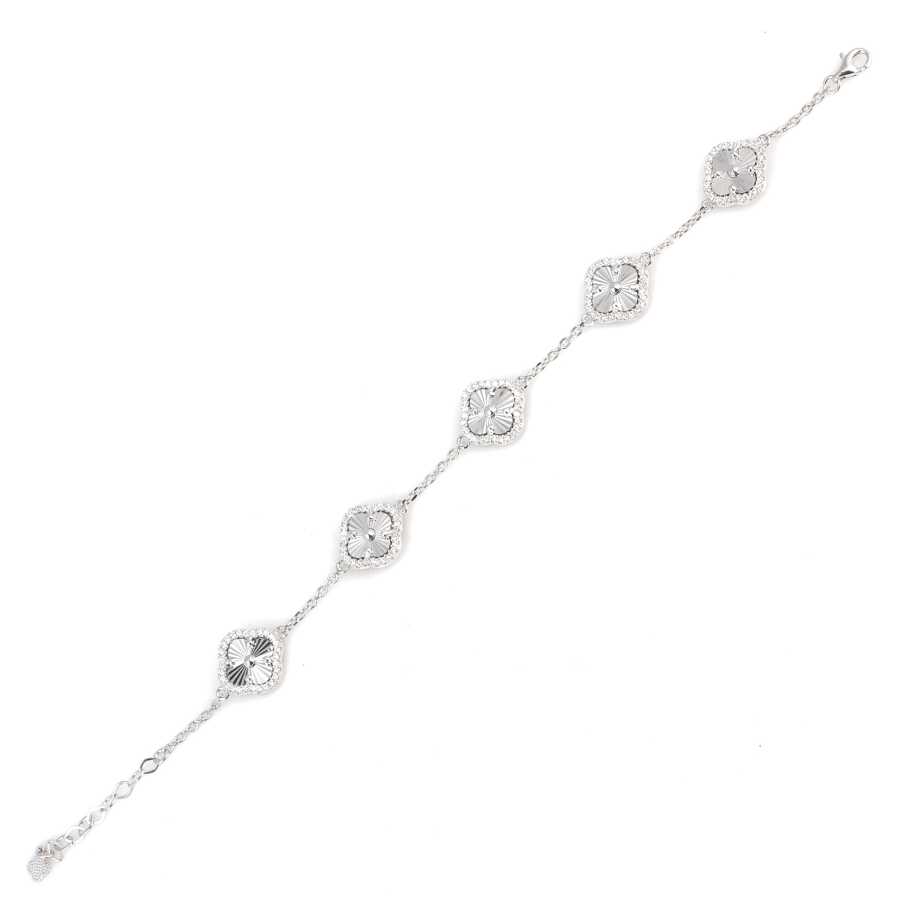 Gelince Haber VerGümüş bileklik 925 ayar gümüşten imal edilmiştir Anturaj yonca model bileklik 21 cm'ye kadar uzanır Bileklik 1,4 cm boyutlarında beş adet yonca figüründen oluşmaktadır Bileklik zirkon taş ile süslenmiştir. Gümüş bileklik 12,78 gramdır.