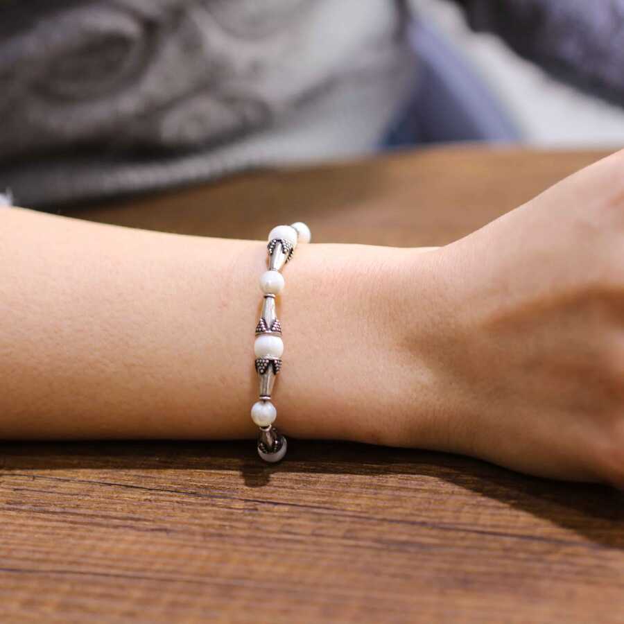Bileklik 925 ayar gümüşten imal edilmiştir. Gümüş parçalı model bileklik 0,8 cm eninde ve 19 cm uzunluğundadır. Bileklik aytaşı taşlıdır. Bileklik taş aralarında gümüş parçalar kullanılarak tasarlanmıştır. Gümüş bileklik 14,77 gram ağırlığındadır.