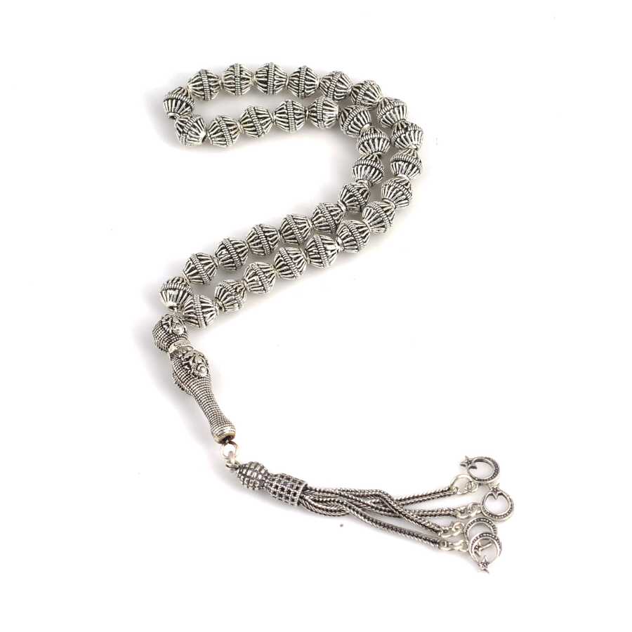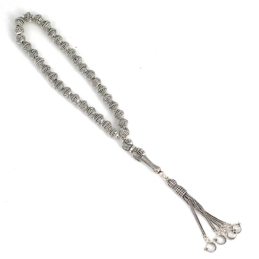 925 Ayar Gümüştür. 8 mm ebadında toplu telkari işlemeli 22 cm uzunluğunda (15,5 cm tesbih + 6,5 cm püskül uzunluğu) tesbihtir. Püskül ucunda ay yıldız figür vardır Ağırlığı 33,87 gramdır.