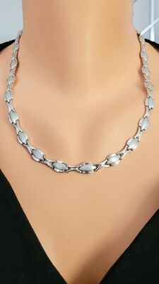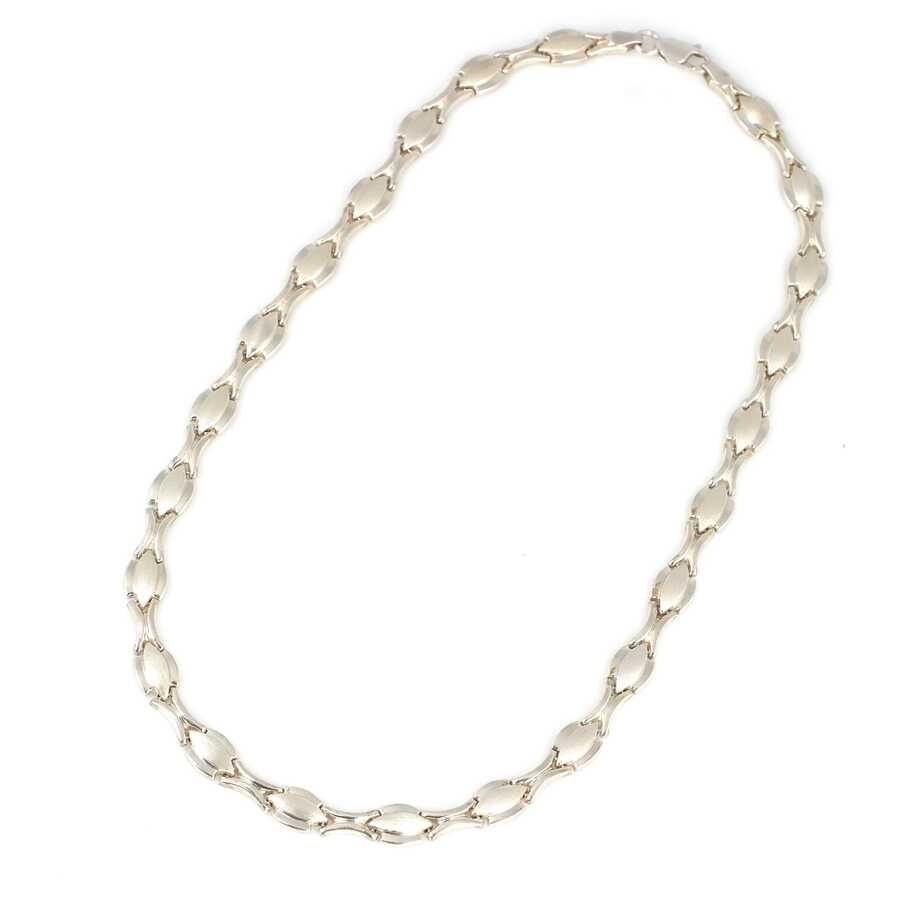 Gümüş kolye 925 ayar gümüşten yapılmıştır. Badem model pres kolye 43 cm uzunluğundadır. Kolye 0,8 cm enindedir. Kolye taşsızdır. Ağırlığı 18,11 gramdır.