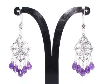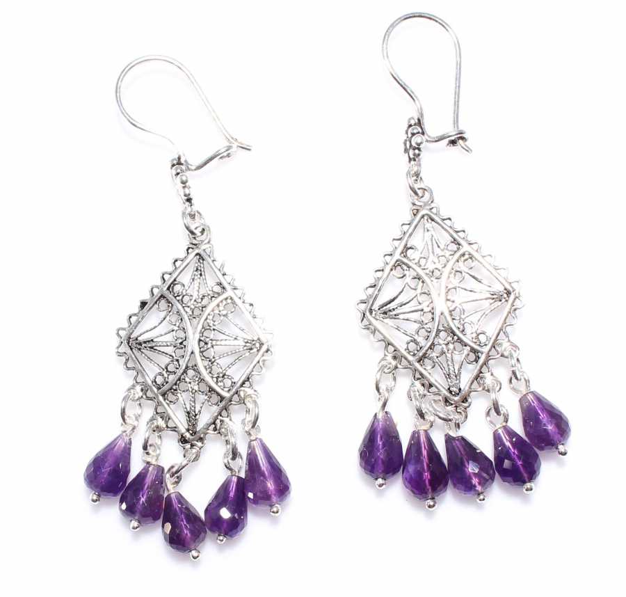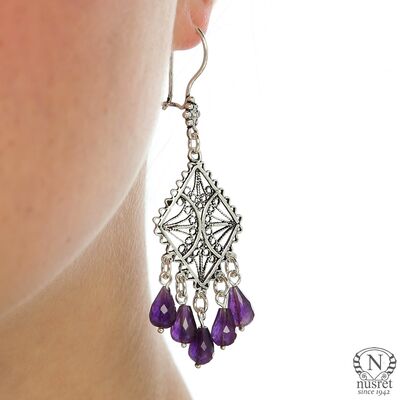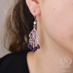 Gümüş telkari küpe 925 ayar gümüşten yapılmıştır. Dörtgen şeklindeki telkari küpe 2,0 cm eninde ve 2,5 cm boyutlarındadır. Telkari küpe damla ametist renk taşlıdır. Ağırlığı 9,08 gramdır.
