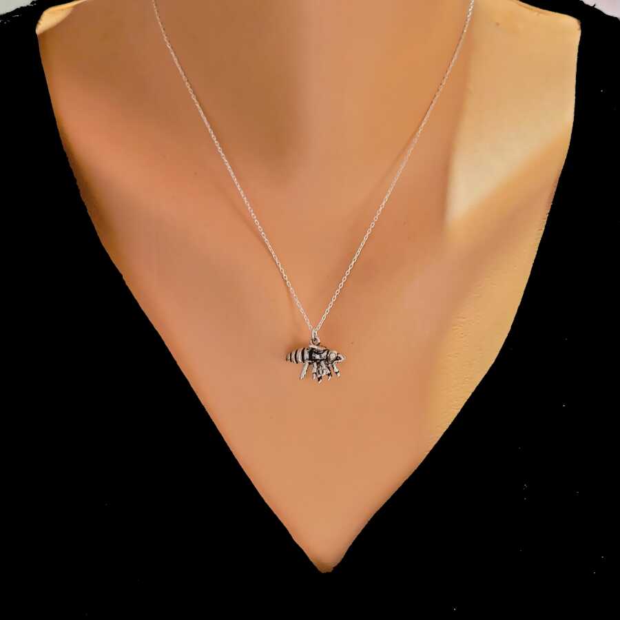 Gümüş kolye 925 ayar gümüşten yapılmıştır. Gümüş kolye 45 cm uzunluğundadır. Bal arısı şeklinde kolye 1,9 cm'ye 1,5 cm boyutlarındadır. Kolye taşsızdır. Charm Kolye 5 gramdır.
