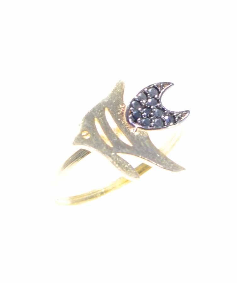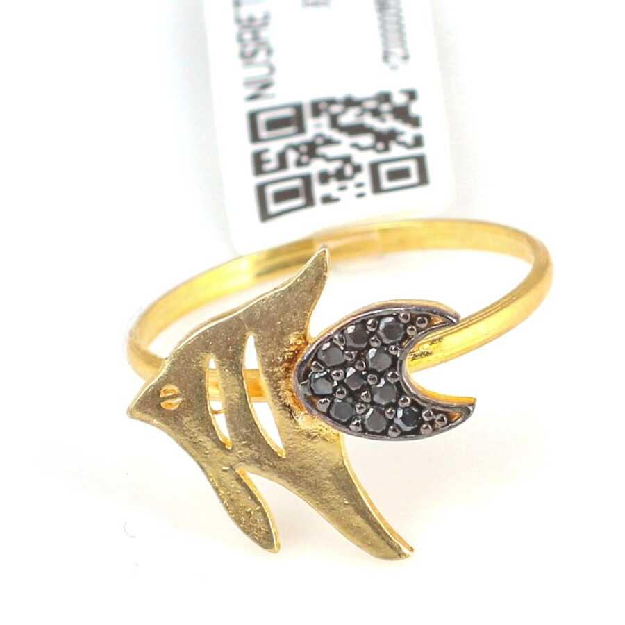 Yüzük 925 ayar gümüşten üretilmiştir. Balık şeklindeki yüzük 14 ölçüdür. Tüm ölçüler yapılabilmektedir. Yüzük siyah zirkon taşlara sahiptir. Sarı rodaj kaplamalıdır. Ağırlığı 1,28 gramdır.