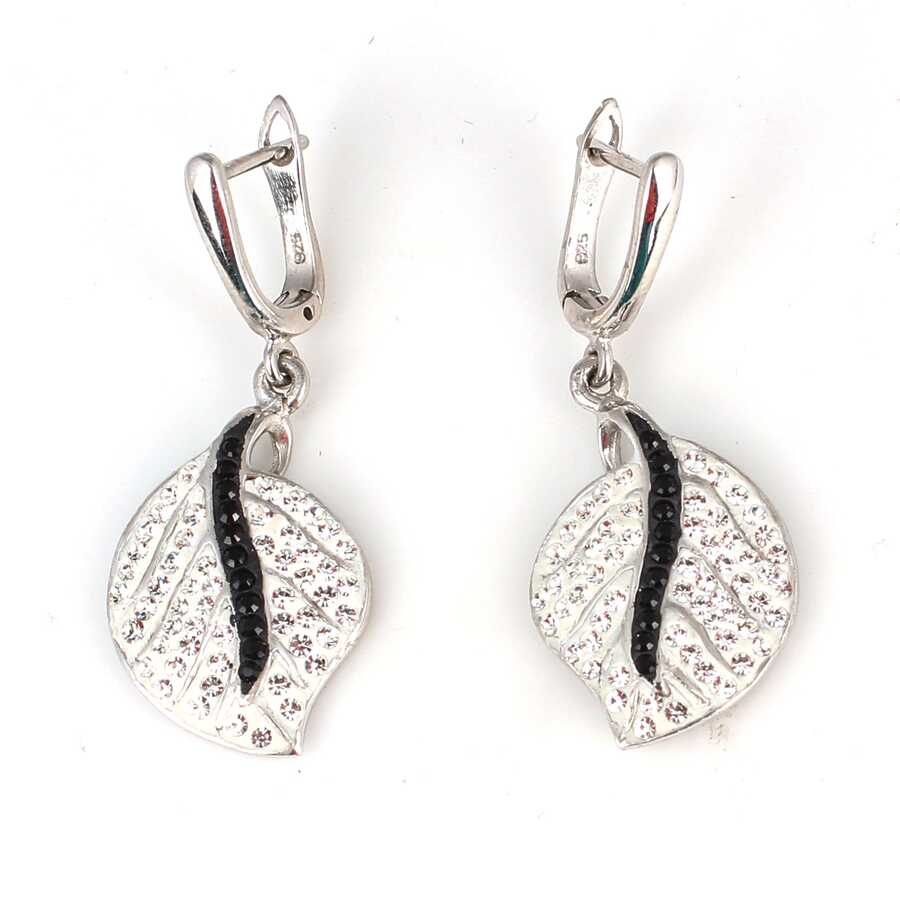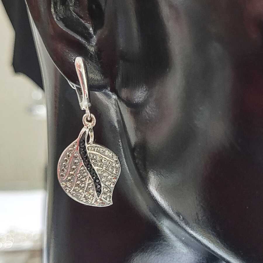 Gümüş küpe 925 ayar gümüşten yapılmıştır. Yaprak şeklindeki taşlı küpe 1,7 cm'ye 4,0 cm boyutlarındadır. Küpe siyah ve beyaz zirkon taşlıdır. Ağırlığı 9,85 gramdır.