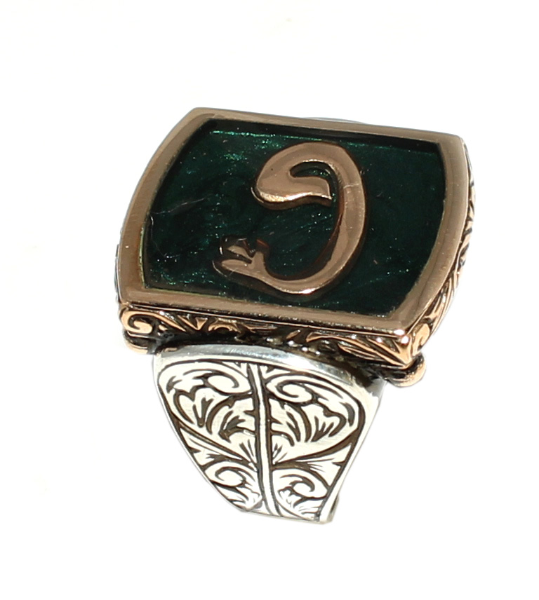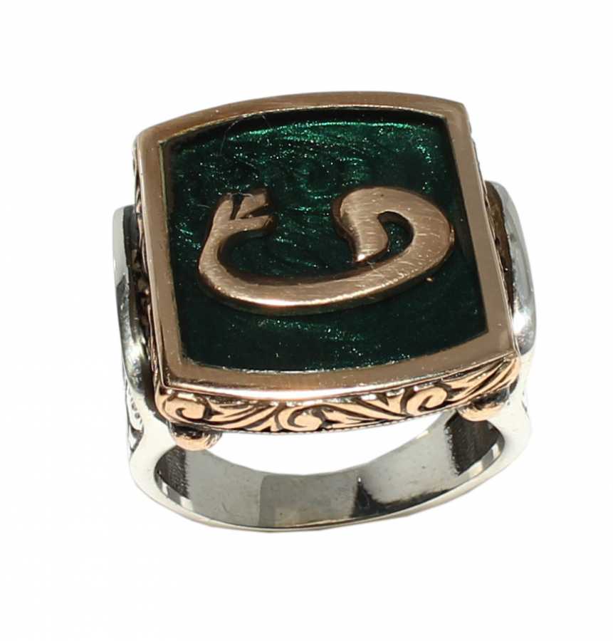 Vav harfi; tevazu, teslimiyet ve manevi derinliğin sembolüdür. Bu 925 ayar gümüş ve bronz karışımı erkek yüzükte, yeşil mineli zemin üzerine işlenen Vav motifi güçlü bir kontrast oluşturur. İki renkli çerçeve tasarımı yüzüğe zengin ve sofistike bir görünüm kazandırırken, yan yüzeylerdeki Osmanlı esintili motifler ustalıkla işlenmiştir.