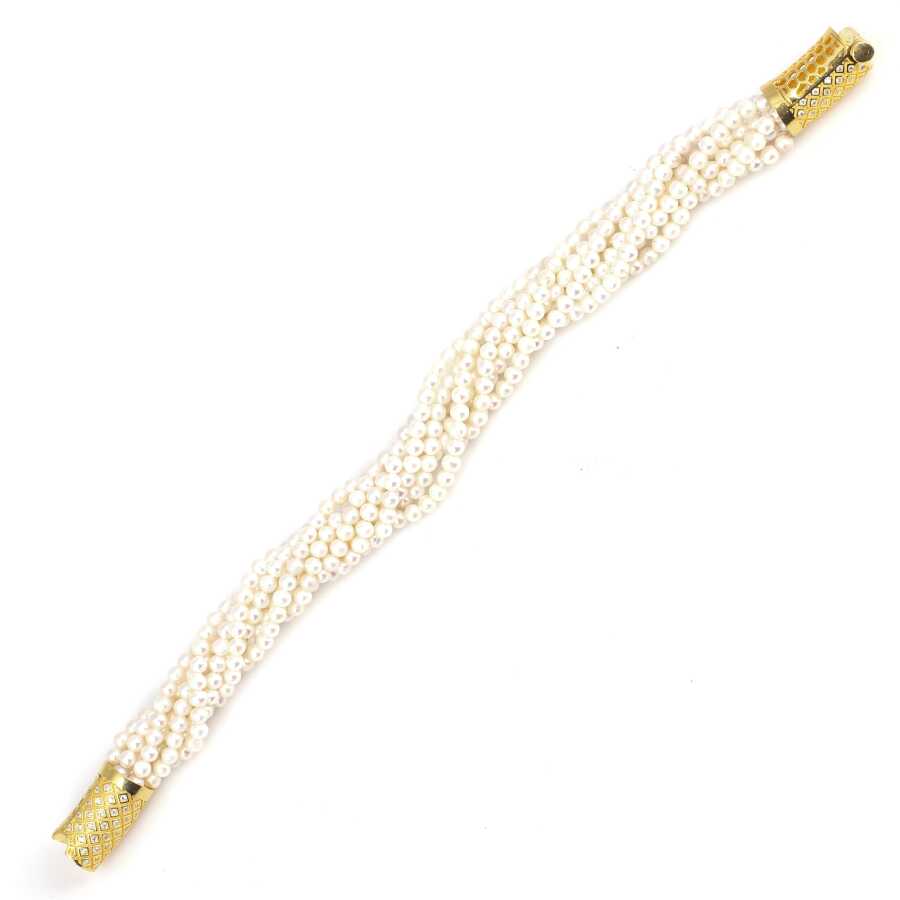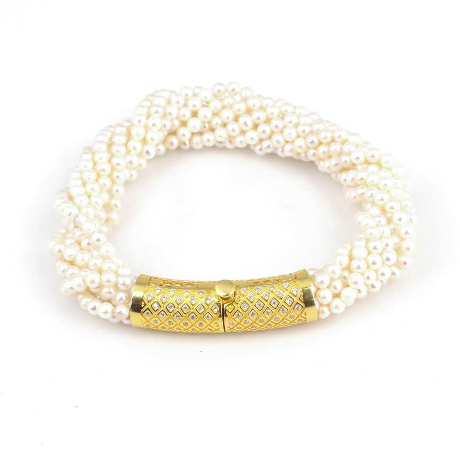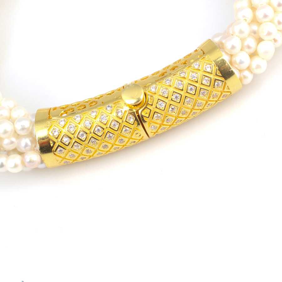 Gümüş bilezik 925 ayar gümüşten imal edilmiştir. Bileziğin kilit kısmı zirkon taşlı ve sarı renk rodajlıdır. 8 sıra inci dizilerek tasarlanmıştır. İnciler 3 mm boyutlarındadır. Gümüş bileklik 20 cm uzunluğunda ve 1 cm kalınlığındadır. Gümüş bilekliğin kilit kısmı basmalı kilit şeklindedir. Ağırlığı 35,92 gramdır.