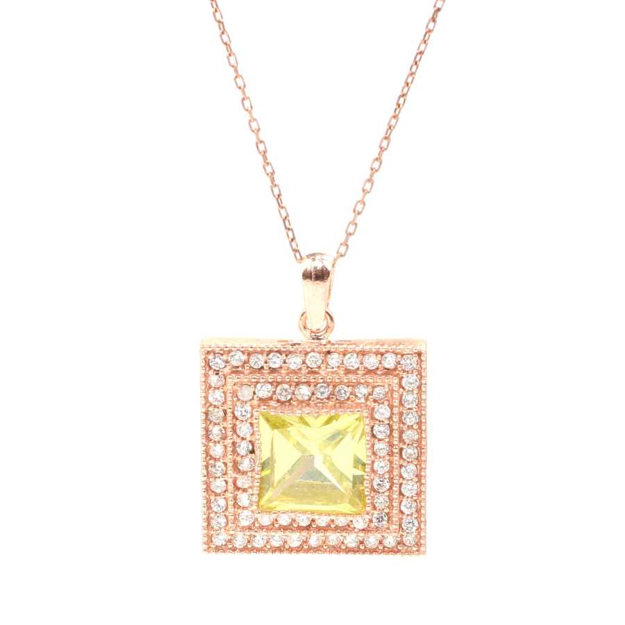 925 Ayar Gümüştür. Sentetik Peridot taşlı kolyenin zincir uzunluğu: 42 + 3 cm dir. Kolyenin ortasındaki taşın ebatı:1,1 x 1,1 cm. kolye ucunun boyutu: 2,1 cm ebatındadır.Roze renkte olup istenirse Sarı veya beyaz renklerinde imal edilir. Gramı: 7,75 gr