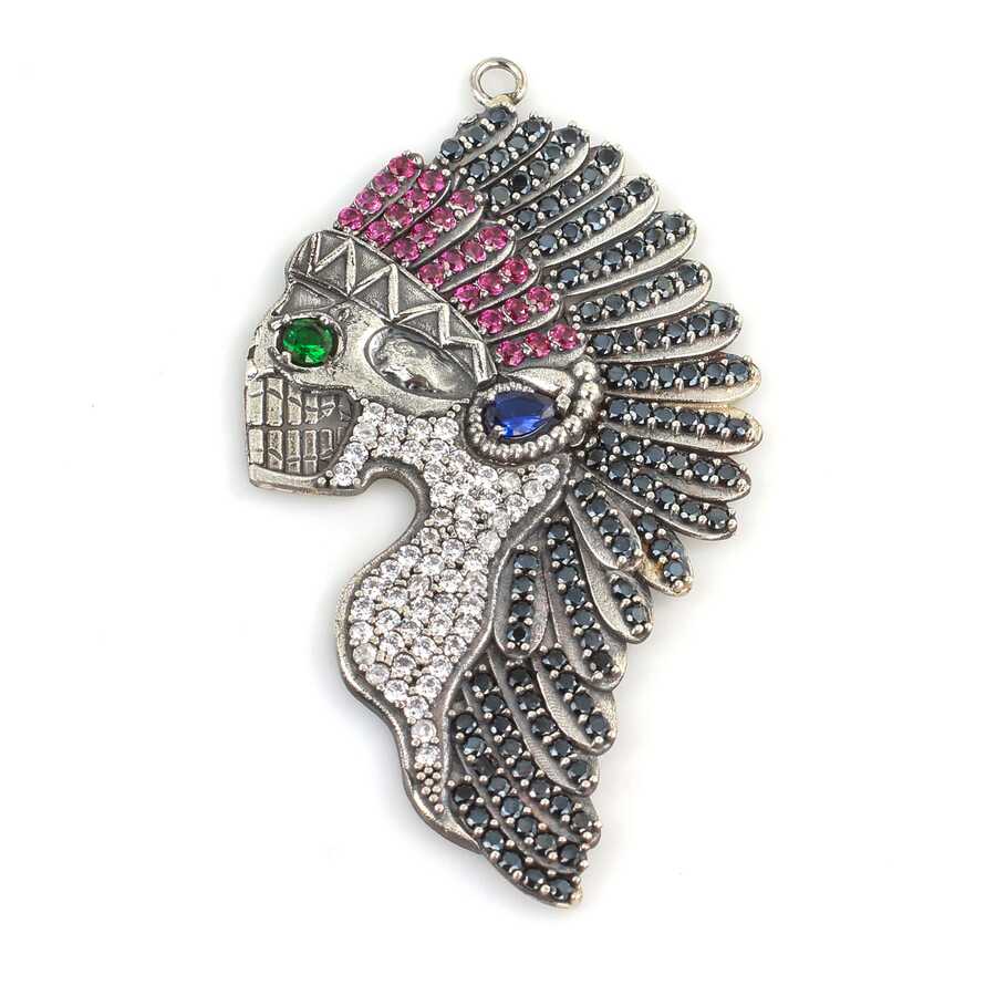 Kolye ucu 925 ayar gümüşten imal edilmiştir. Büyük kızıl derili figürlü kolye ucu 7,6 cm'ye 4,3 cm boyutlarındadır. Zincir dahil değildir. Kolye ucu renkli zirkon taşlıdır. Kolye ucu 18,9 gram ağırlığındadır.
