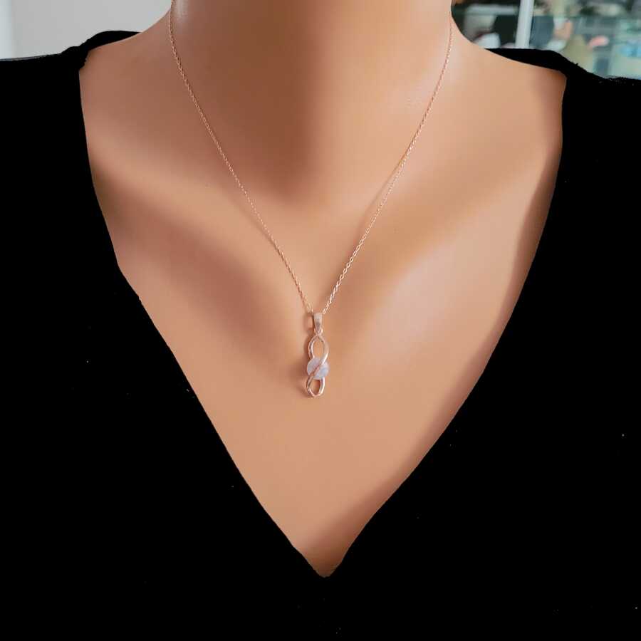 Gümüş kolye 925 ayar gümüşten yapılmıştır. Sonsuzluk şeklindeki kolye 2,5 cm'ye 0,7 cm boyutlarındadır. Zinciri 45 cm uzunluğundadır ve taşları buzlu aytaşıdır. Ağırlığı 2,8 gramdır.