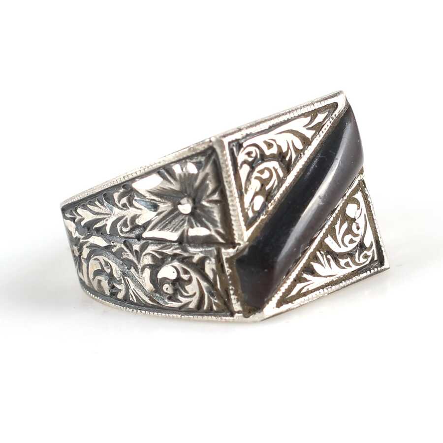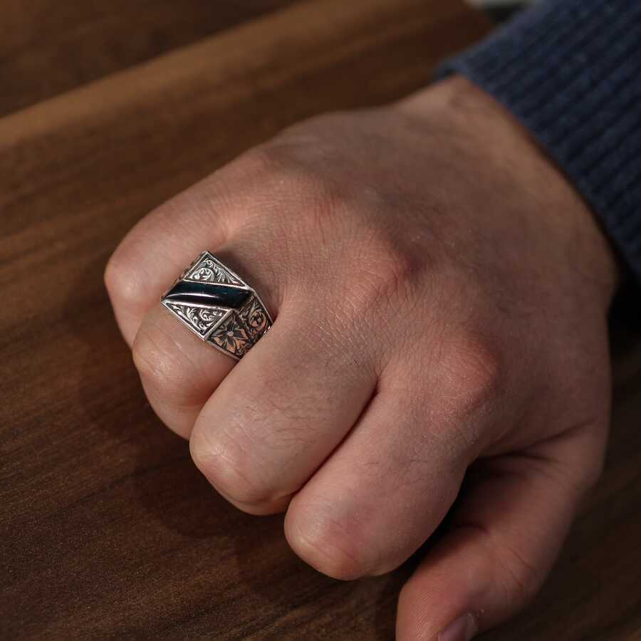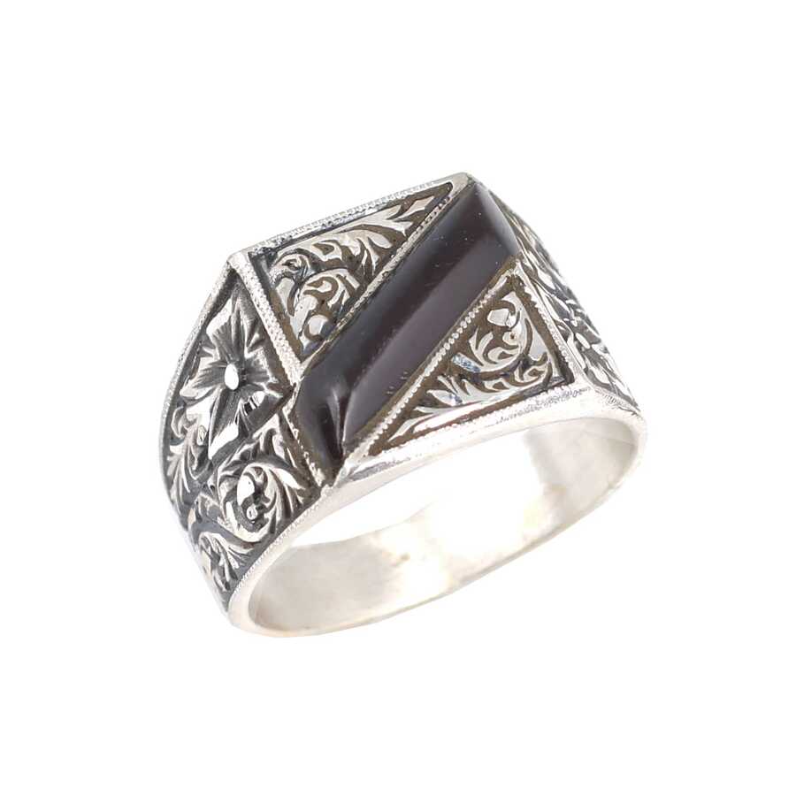 925 Ayar Gümüş Çapraz Sıkma Kehribar Taşlı Elişi Kalemli Erkek Yüzük