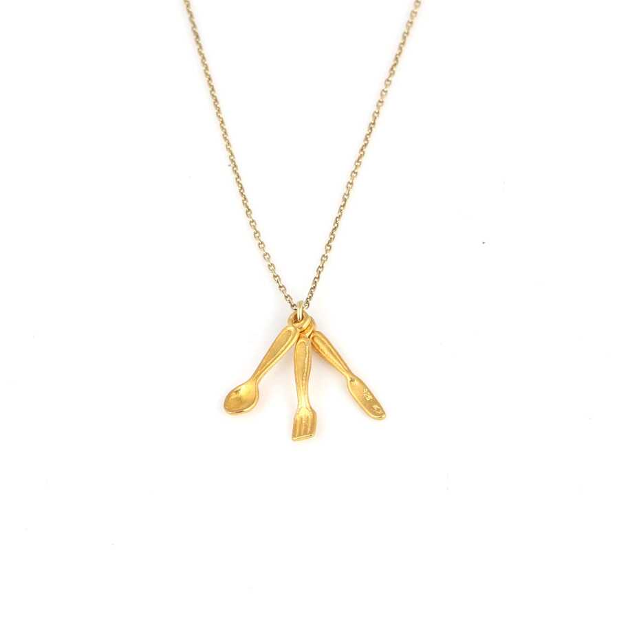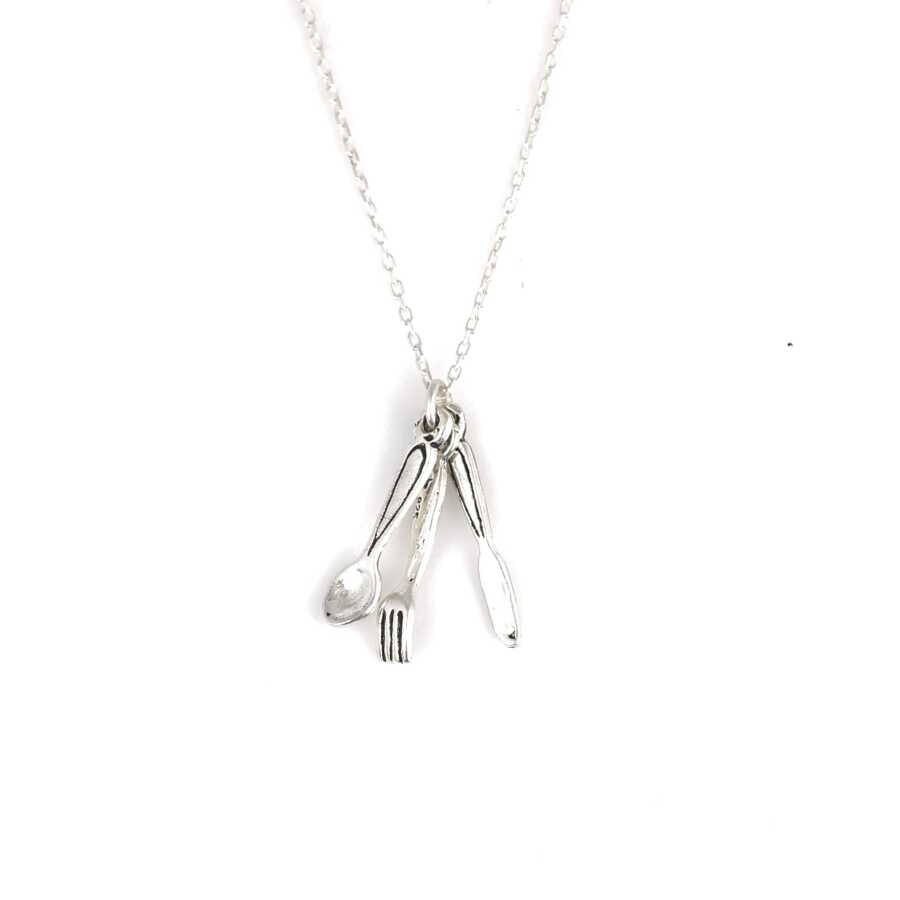 Gümüş kolye 925 ayar gümüşten yapılmıştır. Gümüş kolye 45 cm uzunluğundadır. Çatal, bıçak, kaşık şeklinde kolye 2 cm boyutlarındadır. Kolye taşsızdır. Charm Kolye 2,7 gramdır.