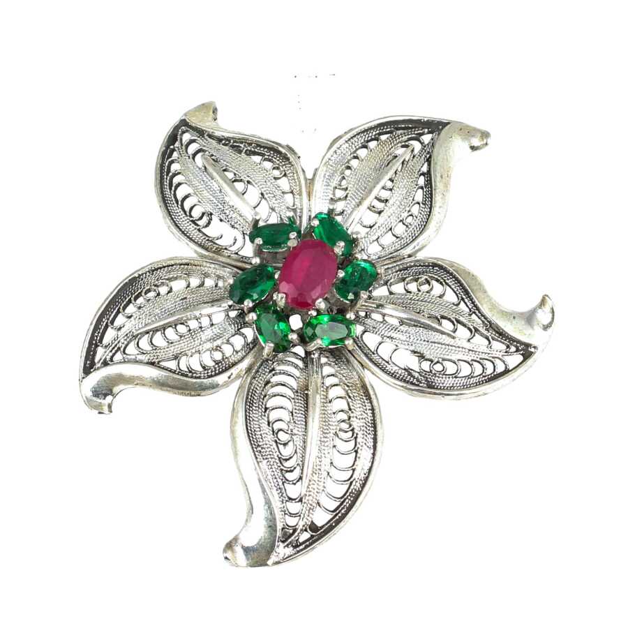 Broş 925 ayar gümüş olarak imal edilmiştir. Çiçek şeklindeki telkari broş 5,0 cm'ye 4,4 cm boyutlarındadır. Gümüş broş zirkon taşlıdır. Gümüş broş 12,15 gramdır.