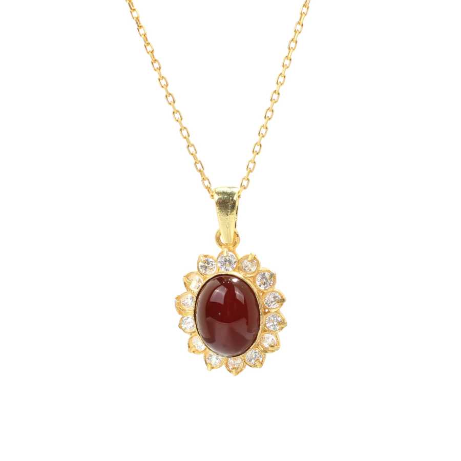 925 Ayar Gümüştür. Çiçek Şeklinde Oval Akik taşlı kolyenin zincir uzunluğu: 42+3 cm. Ebadı 2,2 x 1,3 cm. Kolye rengi sarı olup istek üzerine beyaz ve pembe renklerinide imal edilmektedir. Gramı: 3,15 gr