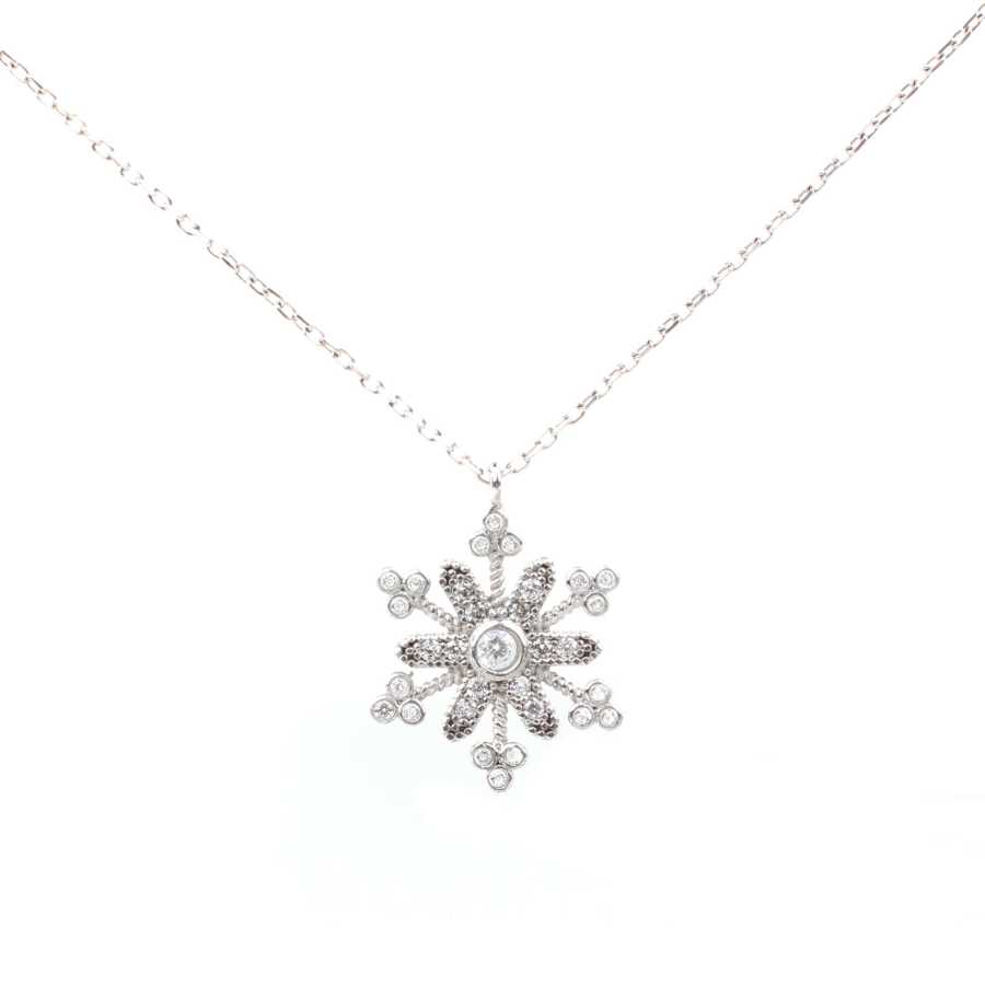 Gümüş kolye 925 ayar gümüşten yapılmıştır. Kar tanesi şeklindeki kolye 1,5 cm'ye 1,7 cm boyutlarındadır. Zinciri 45 cm uzunluğundadır ve taşları beyaz zirkondur. Ağırlığı 2,21 gramdır.