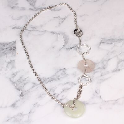 Gümüş kolye 925 ayar gümüşten yapılmıştır. Gümüş kolye 48 cm uzunluğundadır. Kolye pembe kuvars, aytaşı ve zirkon taşlıdır. Gümüş zincir ile aralarına çiçek figürü ve taşlar eklenerek tasarlanmış kolyedir. Ağırlığı 27,08 gramdır.